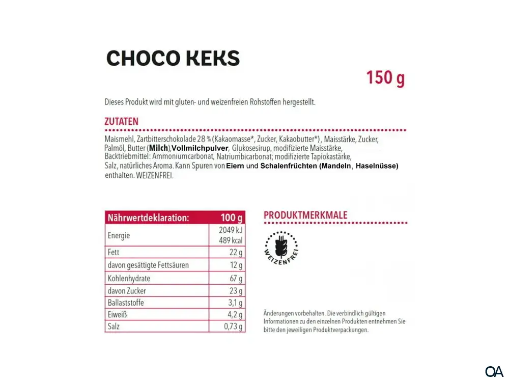 - Zutaten: Maismehl, Zartbitterschokolade 28% (Kakaomasse*, Zucker, Kakaobutter*), Maisstärke, Zucker, Palmöl, Butter (Milch), Milchpulver, Glucosesirup, modifizierte Maisstärke, Backtriebmittel: Ammoniumcarbonate, Natriumbicarbonat; modifizierte Tapiokastärke, Salz, natürliches Aroma. Kann Spuren von Eier und Schalenfrüchte (Mandel, Haselnuss) enthalten. *Rainforest Alliance Certified.