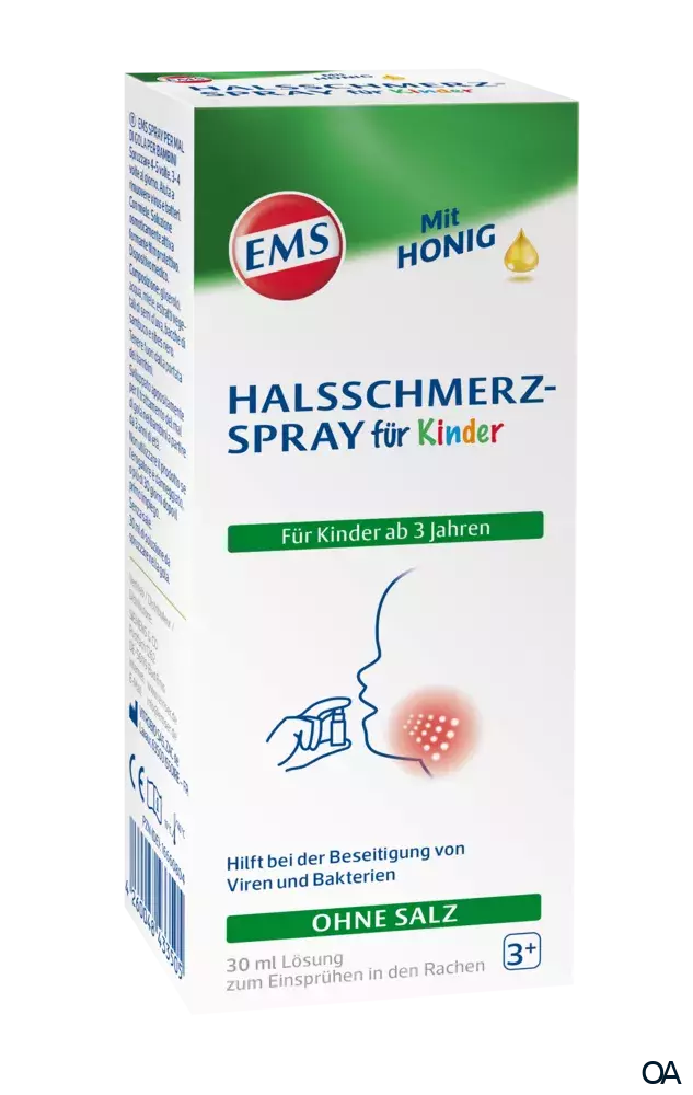 Eine Entzündung der Rachenschleimhaut und Schluckbeschwerden machen auch Kindern zu schaffen: Ihr Unwohlsein zeigen sie oft durch Quengeln, wegen der Halsschmerzen wollen sie nichts essen oder trinken. Das EMS Halsschmerz-Spray speziell für Kinder ab 3 Jahren kann die Rachenentzündung sanft lindern – und das mit einer 100 % natürlichen Wirkweise! Ob zu Hause oder unterwegs: Das Spray lässt sich einfach und sicher anwenden.
