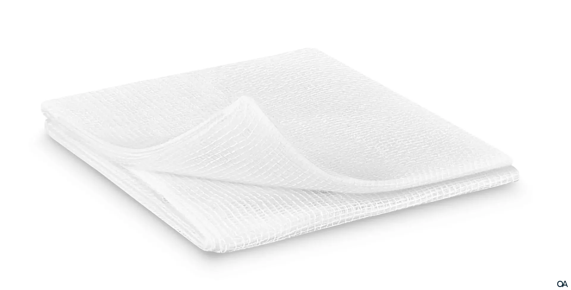 Aus Verbandmull EN 14079, 17-fädig, mit eingeschlagenen Schnittkanten (= ES), auch mehrfach aufgeklappt in größeren Formaten verwendbar, ohne dass störende Randfäden auftreten, gute Saugfähigkeit, luftdurchlässig, weich und geschmeidig.
