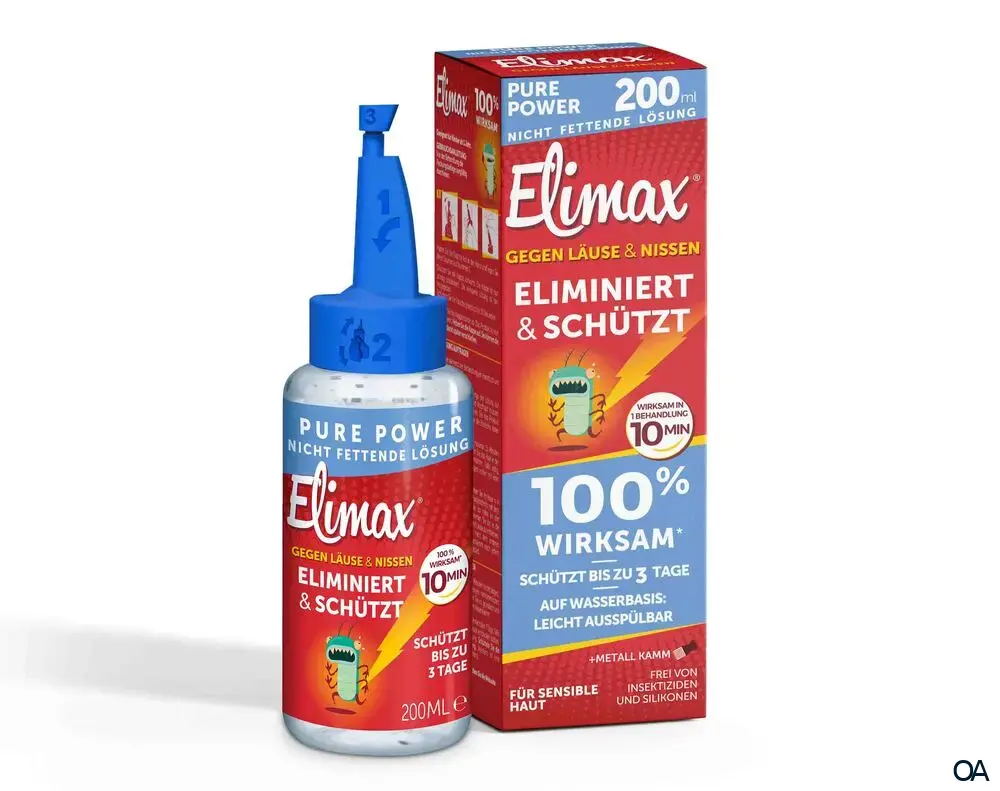 Elimax® Pure Power Lösung gegen Läuse und Nissen: Wirkungsvoll, sicher und einfach anzuwenden. Bis zu 3 Tage Schutz vor Neubefall. Das erste und einzige Produkt gegen Läuse auf Wasserbasis.