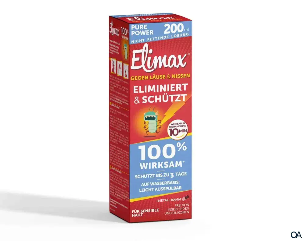 Elimax® Pure Power ist eine wirksame Lösung gegen Läuse und Nissen. Es besteht aus 2 Flüssigkeiten die vor Gebrauch gemixt werden müssen. Der Wirkstoff besteht aus einer speziell dafür entwickelten Substanz Prosil und dem Läuse-Schutzfaktor (LPF®). Das patentierte Prosil wurde aufgrund der starken Wirkung gegen Kopfläuse ausgewählt. Die Mixtur überzeugt mit doppelter Wirkung: Sie blockiert die Atemlöcher der Läuse und entzieht der Haut der Laus bereits nach 10 Minuten Flüssigkeit. Elimax® Pure Power enthält keine neurotoxischen Insektizide, dadurch kann keine Resistenz aufgebaut werden. Elimax® Pure Power beinhaltet kein Silikon (Dimethicon), daher kommt es zu keinen fettigen Rückständen im Haar. Um einen optimalen Schutz gegen Läuse zu gewährleisten, beinhaltet Elimax® den LPF®. Dieser Faktor macht das Haar äußerst unattraktiv für Läuse.