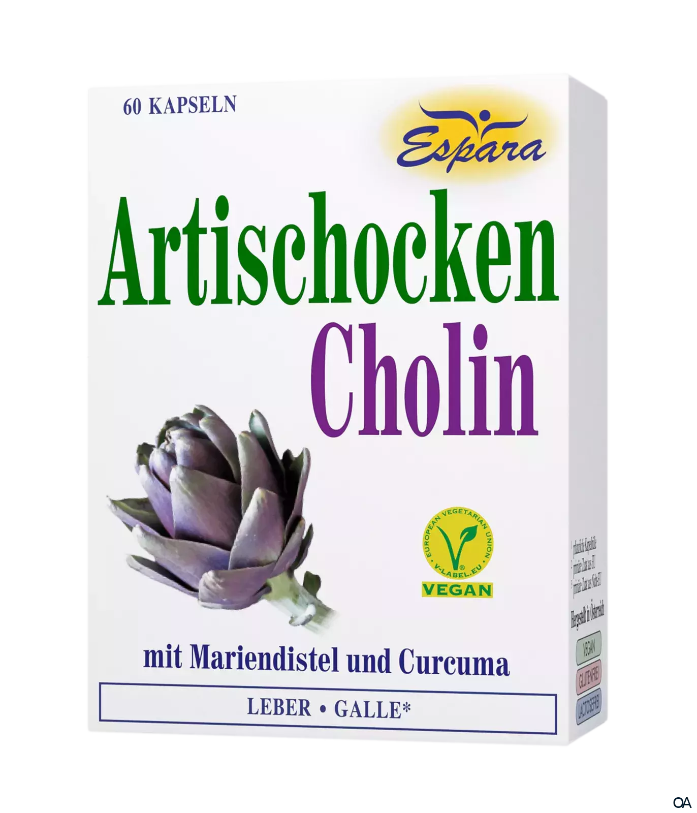 Espara Artischocken-Cholin Kapseln sind ein Nahrungsergänzungsmittel mit Cholin in Kombination mit Artischocke, Mariendistel und Curcuma. Cholin trägt zur Aufrechterhaltung der normalen Leberfunktion bei.