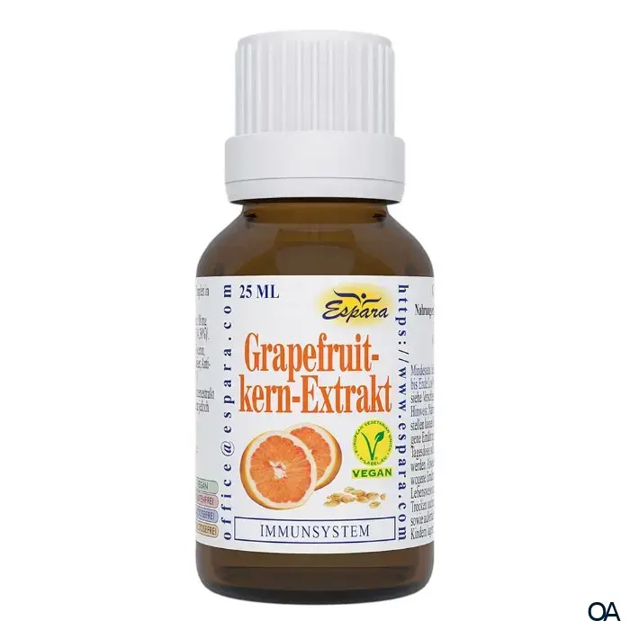 Der Espara Grapefruitkern-Extrakt ist ein Nahrungsergänzungsmittel mit bioflavonoidreichem Grapefruitkern-Extrakt (800 mg Bioflavonoide pro 100 ml).