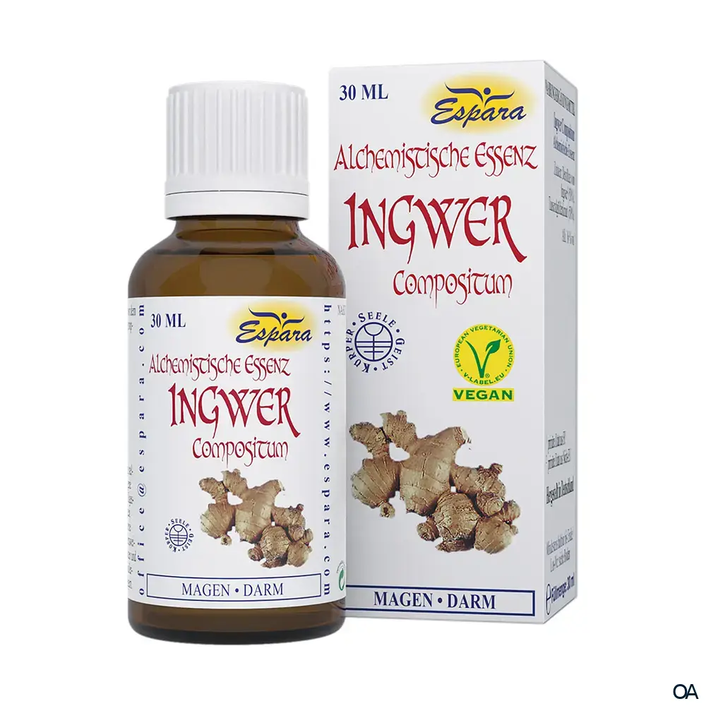 Die Espara Ingwer Compositum Alchemistische Essenz ist ein Nahrungsergänzungsmittel mit Destillaten von Ingwer und Tausendgüldenkraut; hergestellt nach einem speziellen, auf Paracelsus zurückgehenden Verfahren.