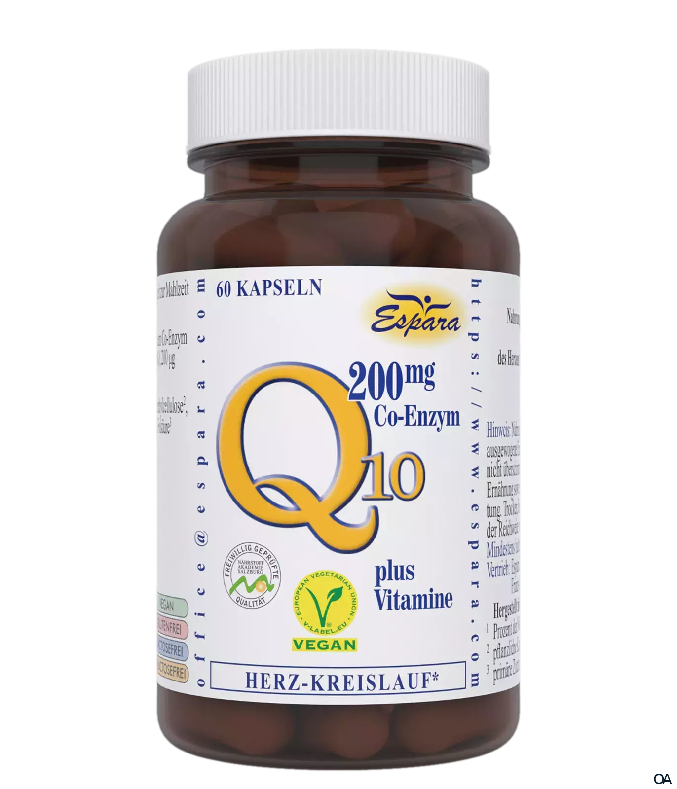 Espara Q10 200 mg Kapseln sind ein Nahrungsergänzungsmittel mit Vitaminen kombiniert mit hochdosiertem Co-Enzym Q10 für die Gesundheit des Herzens. Thiamin trägt zu einer normalen Herzfunktion, Folsäure zu einem normalen Homocystein-Stoffwechsel und einer normalen Blutbildung bei.