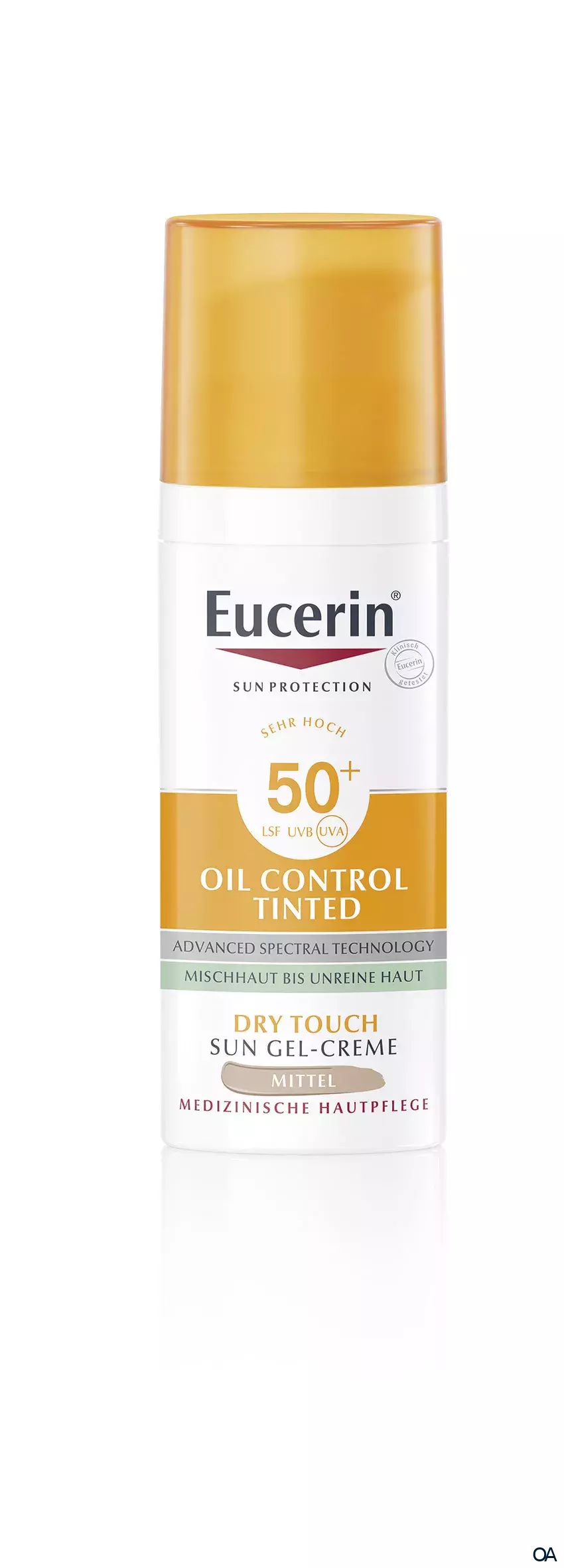 - Eucerin Oil Control Tinted Face Sun Gel-Creme LSF 50+ ist ein getönter Sonnenschutz für die tägliche Anwendung für unreine, zu Akne neigende Haut, der sofort einen gleichmäßigen Teint verleiht und sofort und langanhaltend mattiert.
