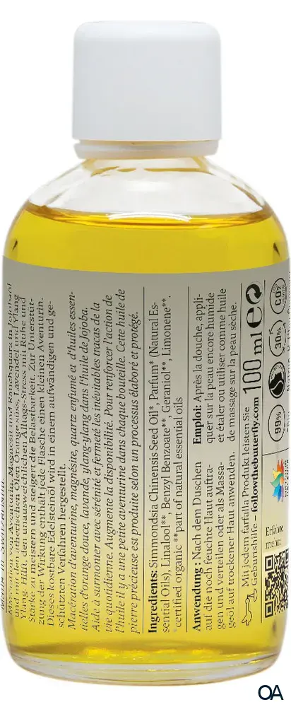 Mazeration von Aventurin, Magnesit und Rauchquarz in Jojobaöl und mit den ätherischen Ölen Orange süß, Lavendel und Ylang Ylang. Hilft, den unausweichlichen Alltags-Stress mit Ruhe und Stärke zu meistern und steigert die Belastbarkeit. Zur Unterstützung der Wirkung enthält jede Flasche einen kleinen Aventurin. Dieses kostbare Edelsteinöl wird in einem aufwändigen und geschützten Verfahren hergestellt.