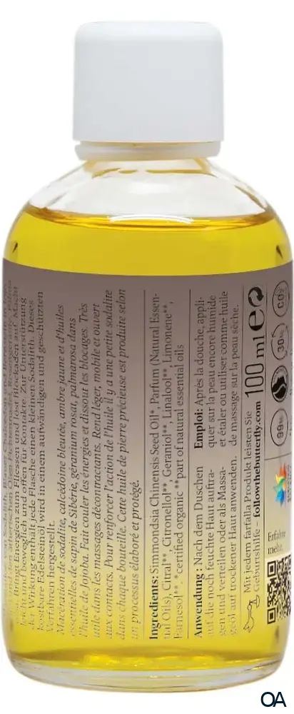 Mazeration von Sodalith, Blauer Chalcedon und Bernstein in Jojobaöl und den ätherischen Ölen Fichtennadel, Rosengeranie, Palmarosa. Bringt Energien zum Fliessen und löst Blockaden auf. Macht leicht und beweglich und offen für Kontakte. Zur Unterstützung der Wirkung enthält jede Flasche einen kleinen Sodalith. Dieses kostbare Edelsteinöl wird in einem aufwändigen und geschützten Verfahren hergestellt.