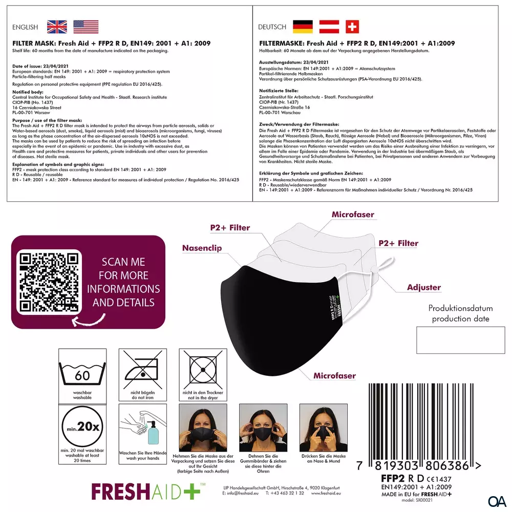 Fresh Aid+ FFP2 RD Komfortmaske schwarz unterstützt leichteres und angenehmeres Atmen als durch herkömmliche FFP2 Masken, dank P2+ Filter. Mindestens 20 mal waschbar bei 60°C.