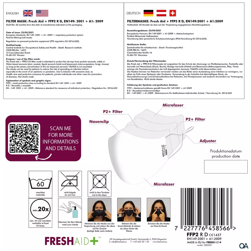 Die Fresh Aid + FFP2 R D Filtermaske ist vorgesehen für den Schutz der Atemwege vor Partikelaerosolen, Feststoffe oder Aerosole auf Wasserbasis (Staub, Rauch), flüssige Aerosole (Nebel) und Bioaerosole