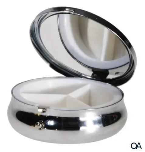 - Runde Pillendose mit drei Fächern und Spiegel im Deckel