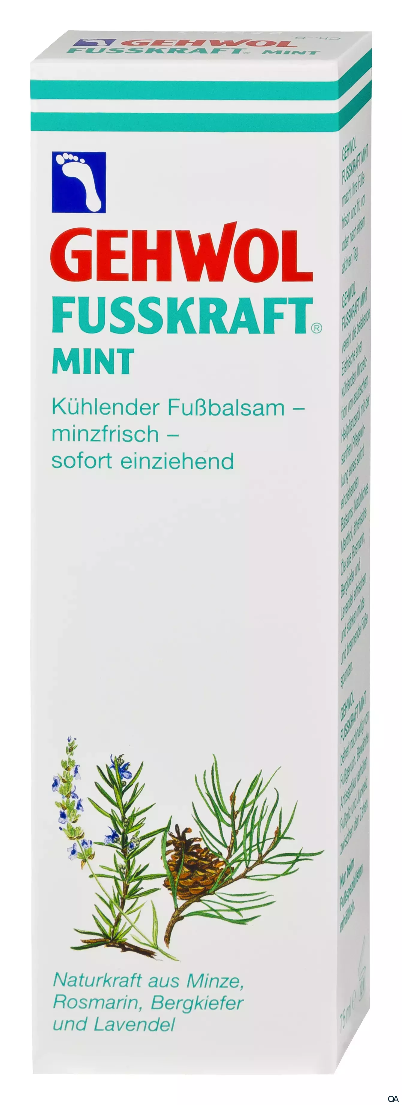 GEHWOL FUSSKRAFT MINT macht Ihre Füße frisch und fit, vor oder nach einem aktiven Tag. Es vereint die belebende Eisfrische einer kühlenden Minzelotion von asiatischem Heilpflanzenöl mit der sanften Pflegewirkung eines sofort einziehenden Balsams. Natürliches Menthol, ätherische Öle aus Rosmarin, Bergkiefer und Lavendel erfrischen und stärken müde und brennende Füße spontan.