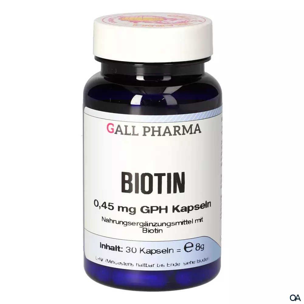 Gall Pharma Biotin 0,45 mg Kapseln sind ein hochwertiges Nahrungsergänzungsmittel mit Biotin, einem wichtigen Vitamin B-Komplex-Vitamin für gesunde Haare, Haut und Nägel. Biotin trägt zur Erhaltung normaler Haare und Haut sowie zur Stärkung der Nägel bei.