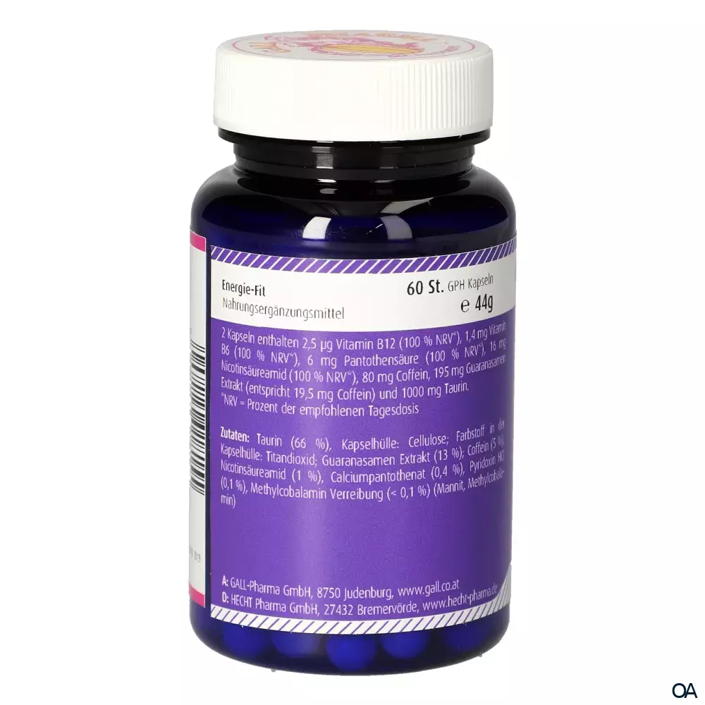 Die Gall Pharma Energie Fit Kapseln sind ein Nahrungsergänzungsmittel mit Taurin, Guarana, Coffein, Niacin, Pantothensäure sowie die Vitamine B6 und B12.