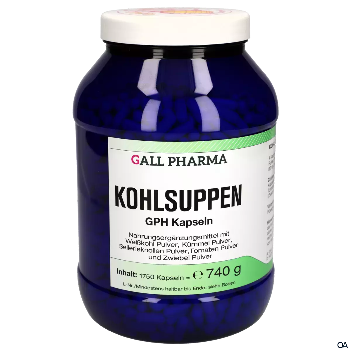 Die Gall Pharma Kohlsuppen Kapseln sind ein Nahrungsergänzungsmittel mit Weißkohl Pulver, Kümmel Pulver, Sellerieknollen Pulver, Tomaten Pulver und Zwiebel Pulver.