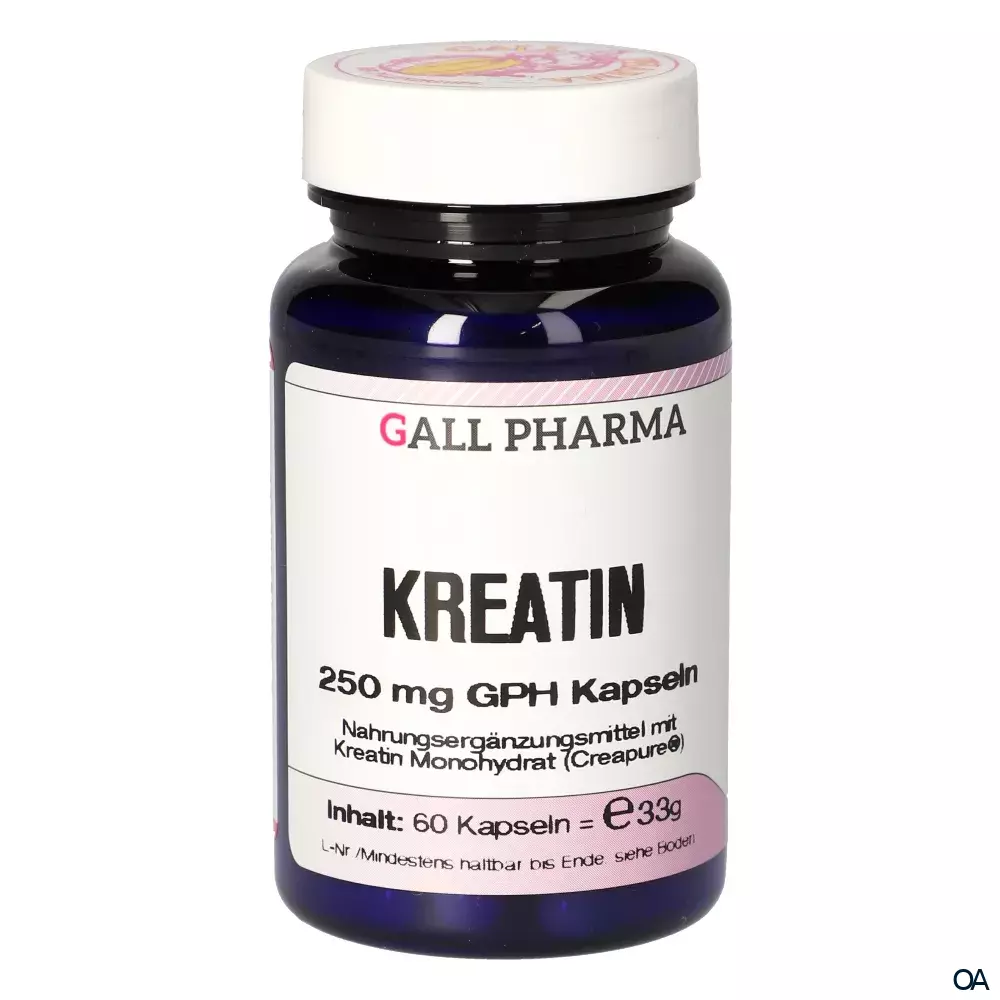 Gall Pharma Kreatin Kapseln ist ein Nahrungsergänzungsmittel mit 250 mg Kreatin Monohydrat pro Kapsel. Kreatin unterstützt den Stoffwechsel und beteiligt sich an der Energieversorgung im Körper, ein Mangel führt zu abnehmender Muskelmasse.