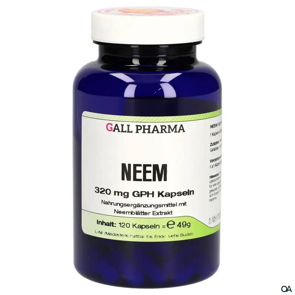 Entdecken Sie die natürliche Kraft des indischen Neembaums mit Gall Pharma Neem 320 mg Kapseln. Jede Kapsel enthält reines, hochdosiertes Neemblatt-Pulver in geprüfter Apothekenqualität zur Unterstützung des allgemeinen Wohlbefindens.