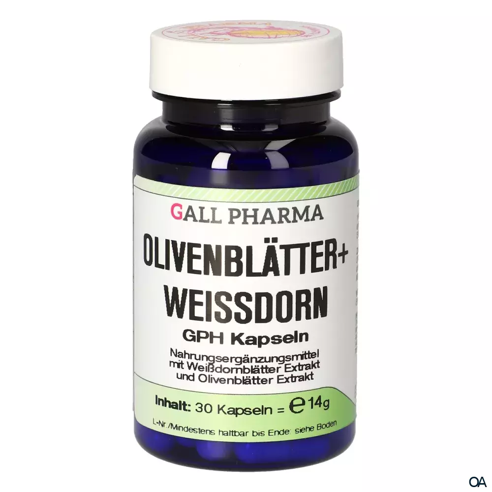 Gall Pharma Olivenblätter + Weißdorn Kapseln sind ein Nahrungsergänzungsmittel mit 120 mg Weißdornextrakt und 265 mg Olivenblätterextrakt. Zur Unterstützung und Stärkung der Herzkreislauffunktion und für einen normalen Blutdruck.