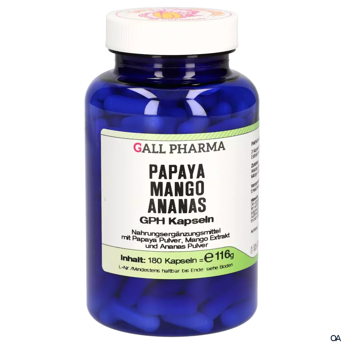 Papaya Mango Ananas GPH Kapseln enthalten je 180 mg Papaya Pulver, Mango Trockenextrakt und Ananas Pulver in einer Cellulosekapsel.