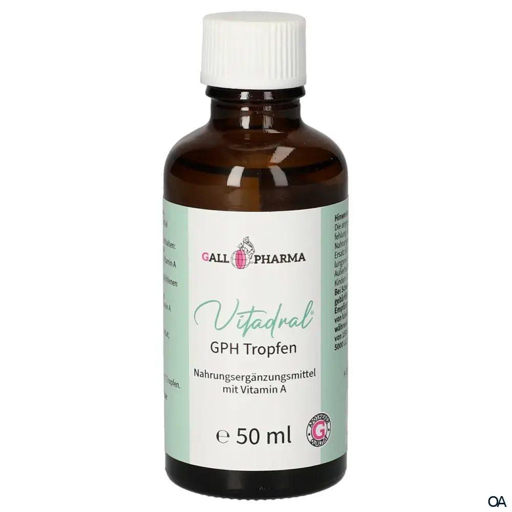 Vitadral® Tropfen von Gall Pharma sind ein Nahrungsergänzungsmittel und enthalten wichtiges Vitamin A zur Unterstützung des Sehvermögens und des Immunsystems. Praktische Tropfenform für eine individuelle Dosierung.