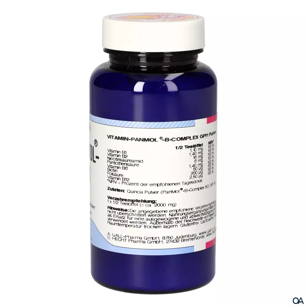 Der VITAMIN PANMOL® B-COMPLEX ist ein wertvoller Komplex aller B-Vitamine. Er wird aus Quinoa-Keimlingen aus kontrolliert biologischem Anbau (kbA-Qualität) gewonnen. Quinoa, das historische Getreide der Inkas, ist frei von Gluten. VITAMIN PANMOL® B-COMPLEX enthält, im Gegensatz zu synthetischen Vitaminen, nicht nur die acht bekannten Vitamine aus der B-Gruppe, sondern auch eine Vielzahl organisch gebundener und biologisch aktiver B-Vitamine. Die B-Vitamine übernehmen unterschiedliche Funktionen und arbeiten im menschlichen Organismus eng zusammen. Sie unterstützen das Immunsystem und die Zellteilung. Vor allem bei einseitiger Ernährung, sowie bei veganer Ernährung kann eine Nahrungsergänzung mit Vitamin PanMol® B-Complex GPH Pulver sinnvoll sein.
