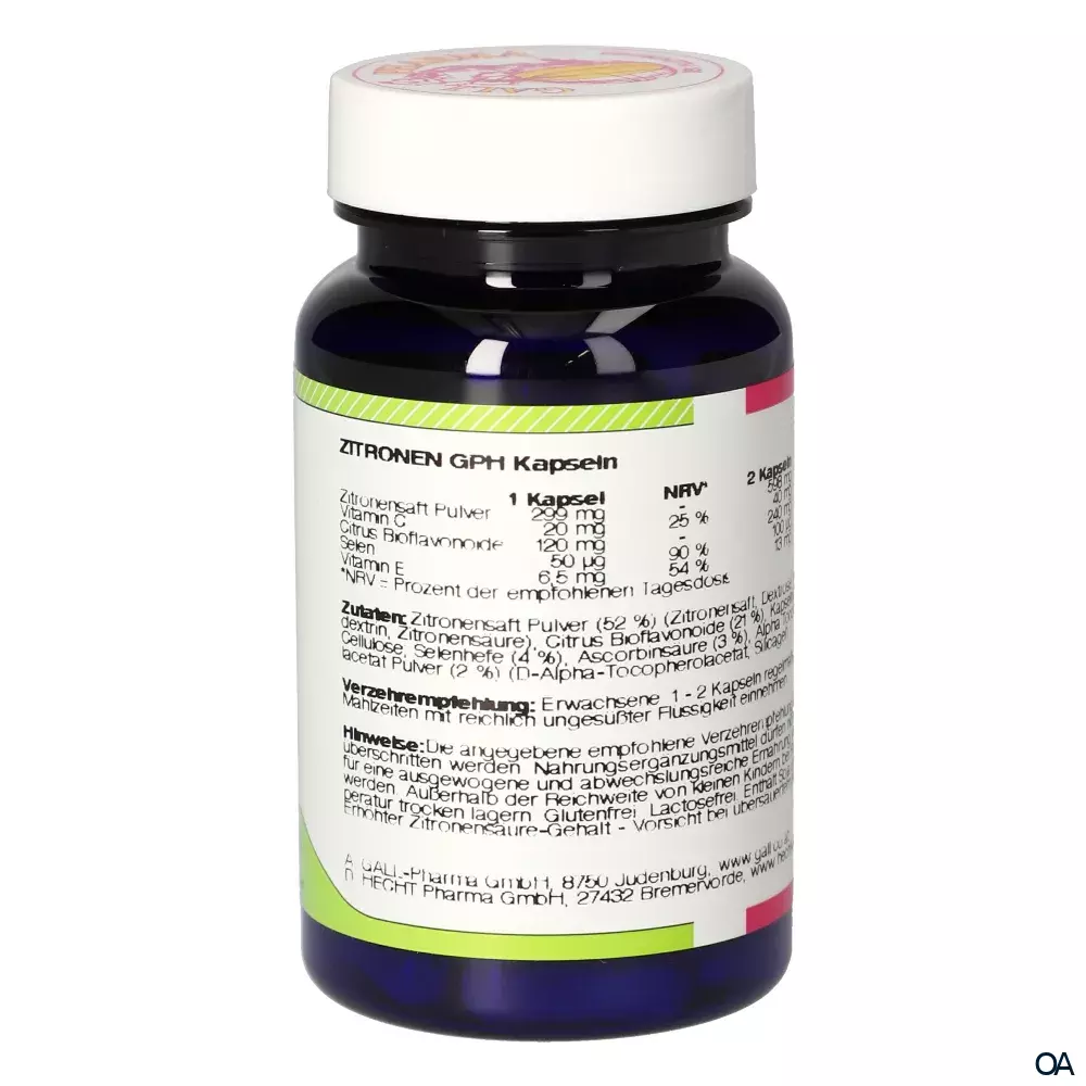 Die Gall Pharma Zitronen Kapseln sind ein Nahrungsergänzungsmittel mit 200 mg Zitronenpulver, 20 mg Vitamin C, 50 µg Selen und 6,5 mg Vitamin E pro Kapsel.