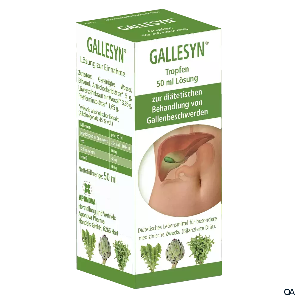 GALLESYN® dient zur diätetischen Behandlung von Gallenbeschwerden, insbesondere bei Störungen der Gallenbildung und -abgabe, nach Gallenblasenoperationen und bei Katarrhen im Gallenbereich. Die rein pflanzlichen Inhaltsstoffe aus Artischockenblättern, Löwenzahn und Pfefferminzblättern wirken verdauungsfördernd, entblähend und krampflösend im Magen-Darm-Gallenbereich, steigern die Gallenbildung in der Leber und erleichtern den Gallenabfluss.