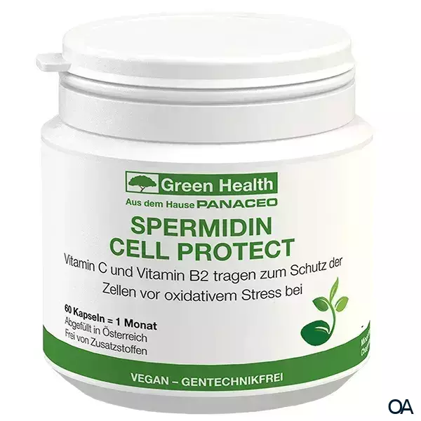 Die Green Health SPERMIDIN CELL PROTECT Kapseln sind ein Nahrungsergänzungsmittel mit Vitamin C und Vitamin B2, diese tragen zum Schutz der Zellen vor oxidativem Stress bei.