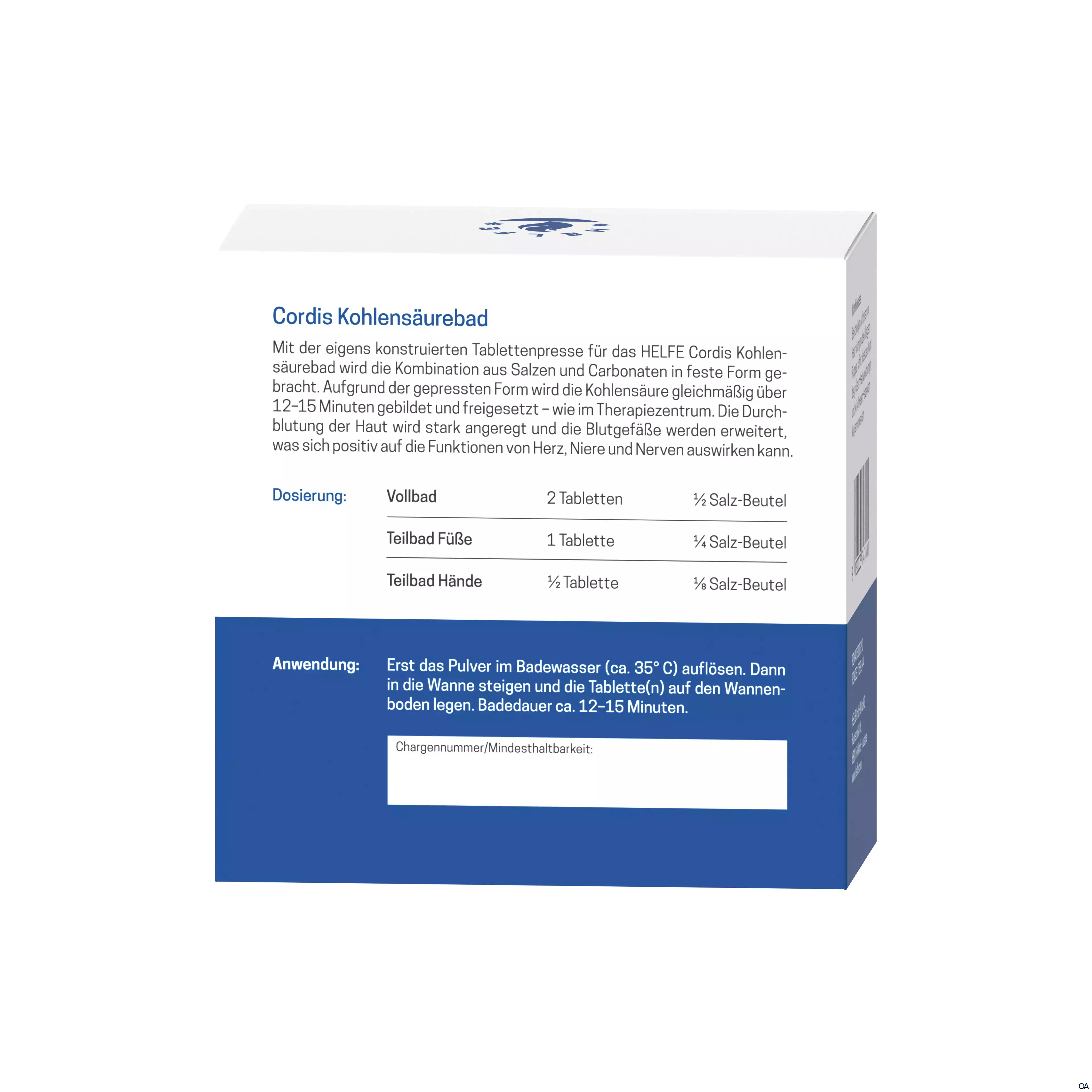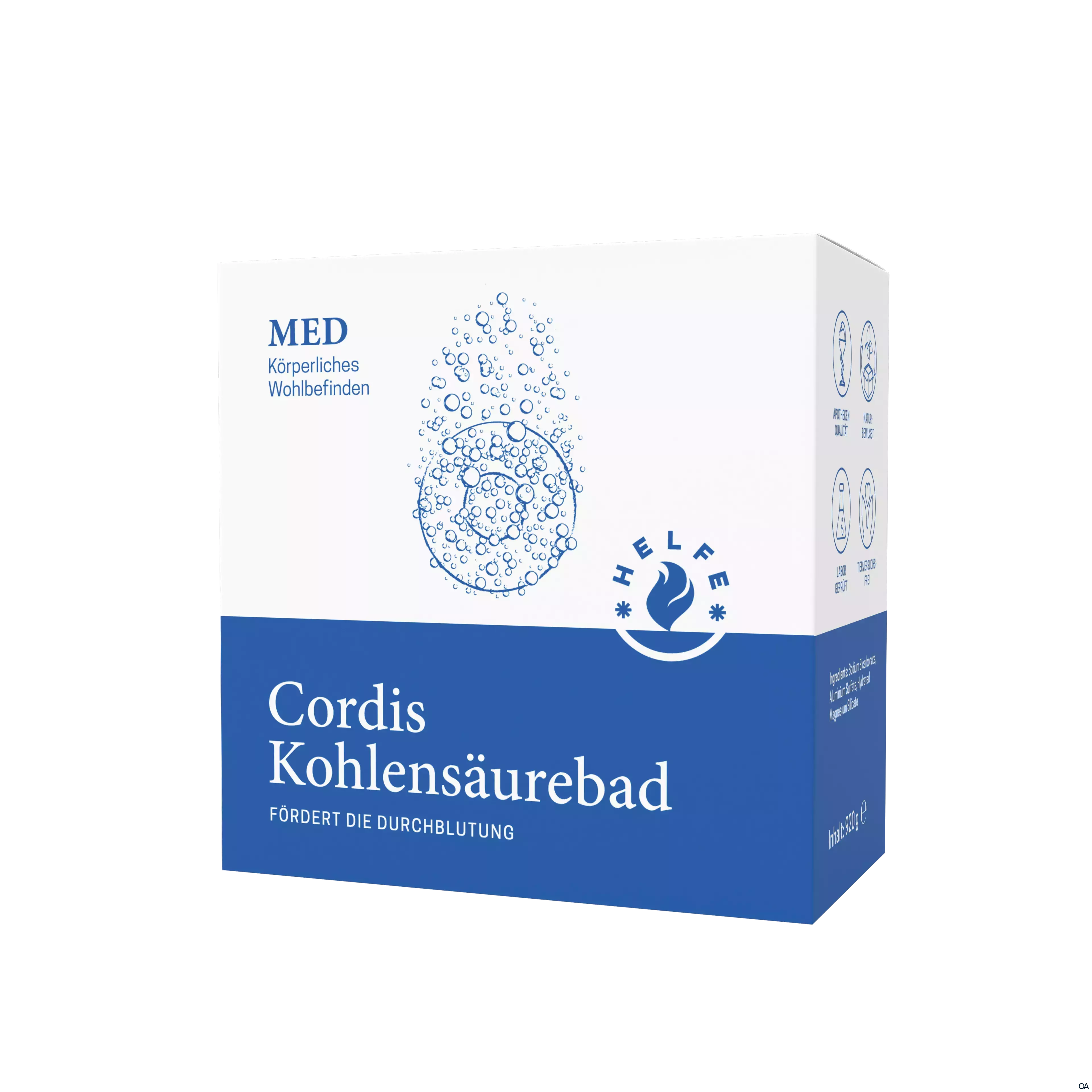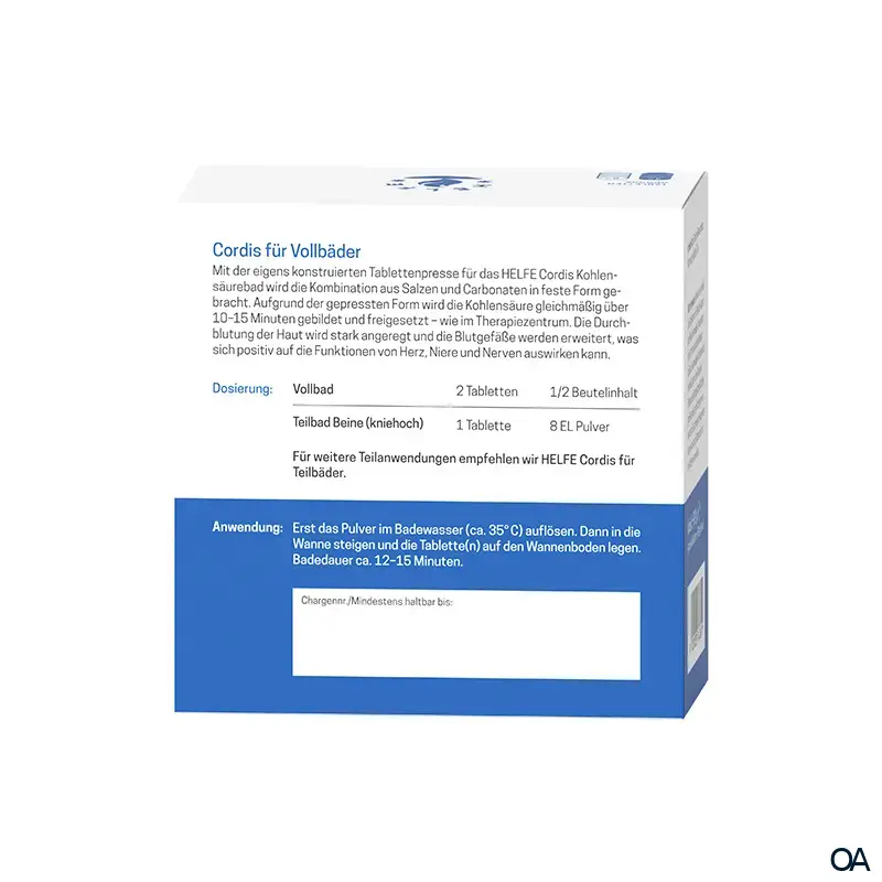 Das HELFE Cordis Kohlensäurebad ist ein Badezusatz (Pulver + Tabletten) zur Herstellung eines Voll- bzw. Teilbades. Die gesundheitsfördernde Wirkung der Kohlensäure entfaltet sich beim Kontakt mit dem Wasser.