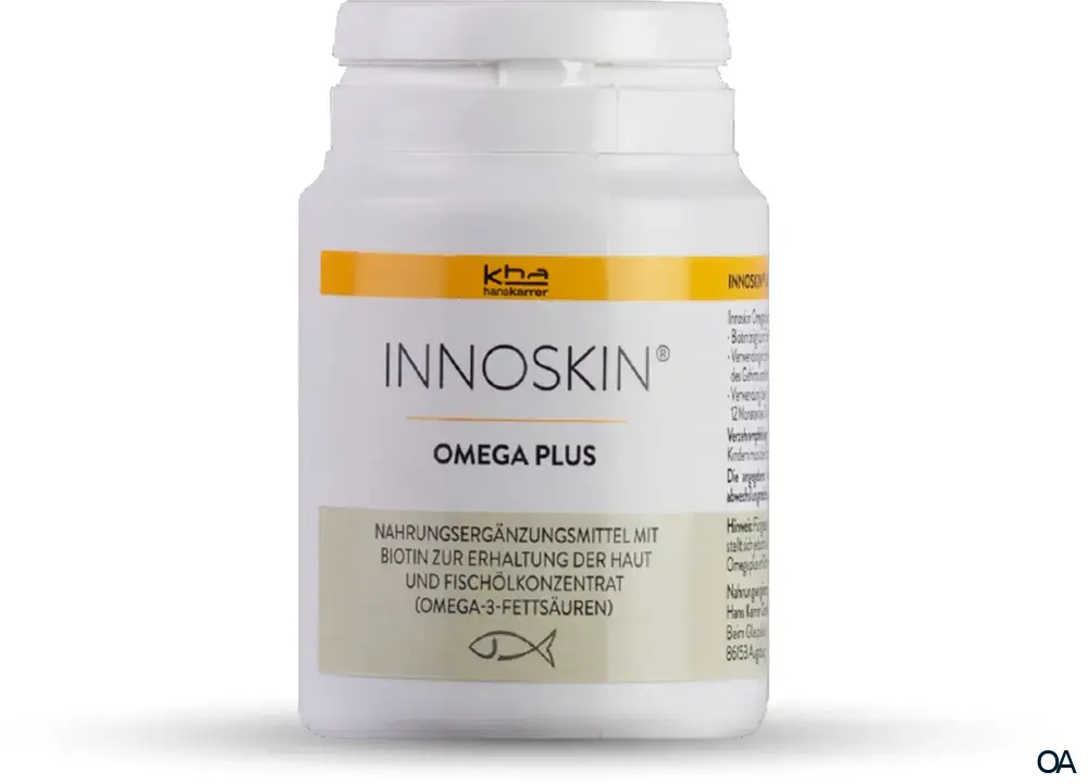 Die Hans Karrer Innoskin® Omega Plus Kapseln sind ein Nahrungsergänzungsmittel mit Biotin zur Erhaltung der Haut und Fischölkonzentrat (Omega-3-Fettsäuren).