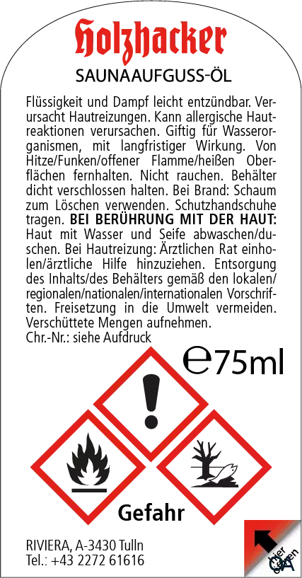 - 5-10 Tropfen auf 5 Liter Wasser, je nach gewünschter Intensität. Flasche nur außerhalb der Sauna verwenden und lagern. Verdünnt sind die Düfte auch in der Aromalampe oder als Raumspray einsetzbar. Für den Frische-Kick zwischen den Saunagängen mit Holzhacker Franzbranntwein einreiben.