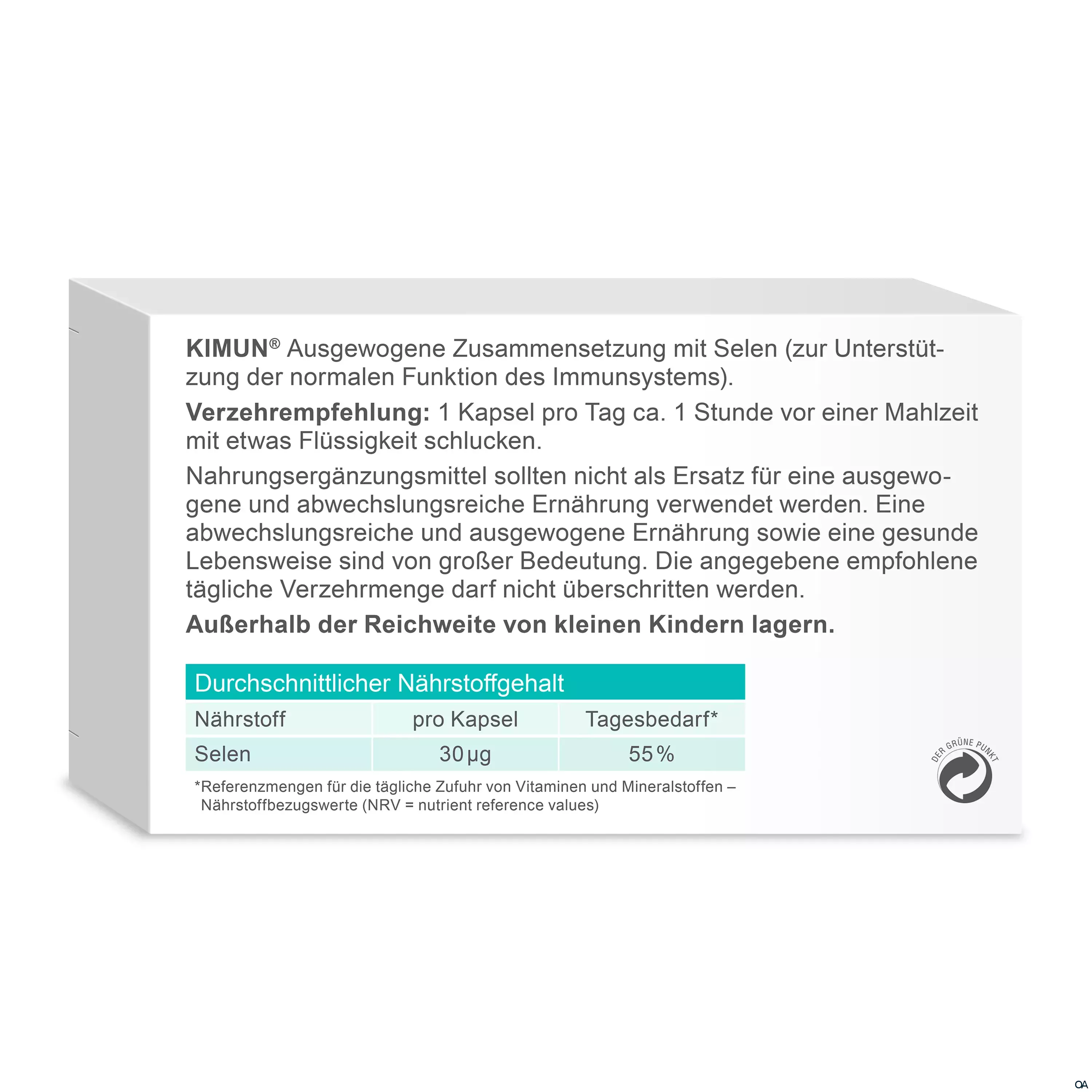 KIMUN® ist ein Nahrungsergänzungsmittel mit dem Spurenelement Selen. So trägt es mit Selen zu einer normalen Funktion des Immunsystems bei und kann die natürlichen Abwehrkräfte des Körpers unterstützen. Die regel- mäßige tägliche Einnahme von KIMUN® ist daher besonders in Belastungssituationen als unterstützende Ernährungsmaßnahme zu empfehlen.