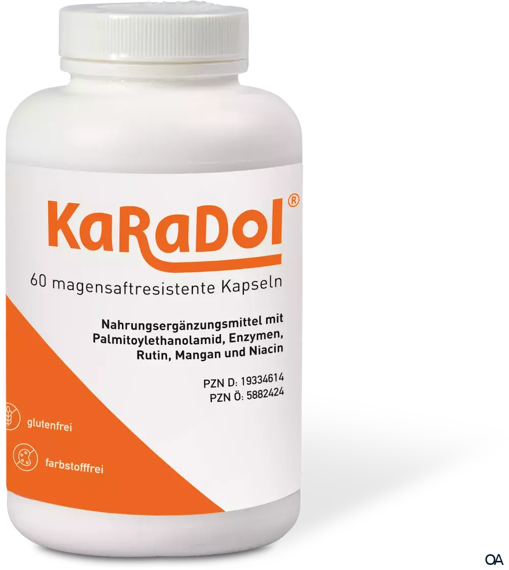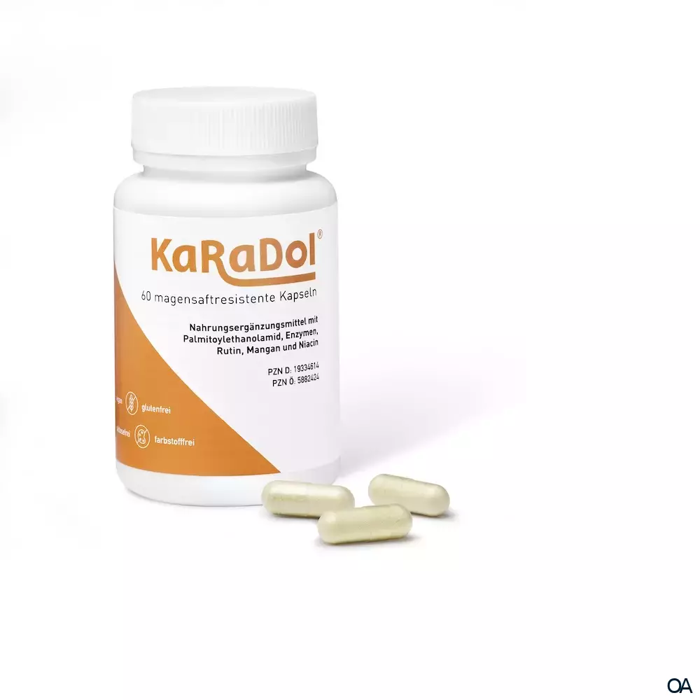 Die KaRaDol® magensaftresistenten Kapseln sind ein Nahrungsergänzungsmittel mit Palmitoylethanolamid, Enzymen, Rutin, Mangan und Niacin.