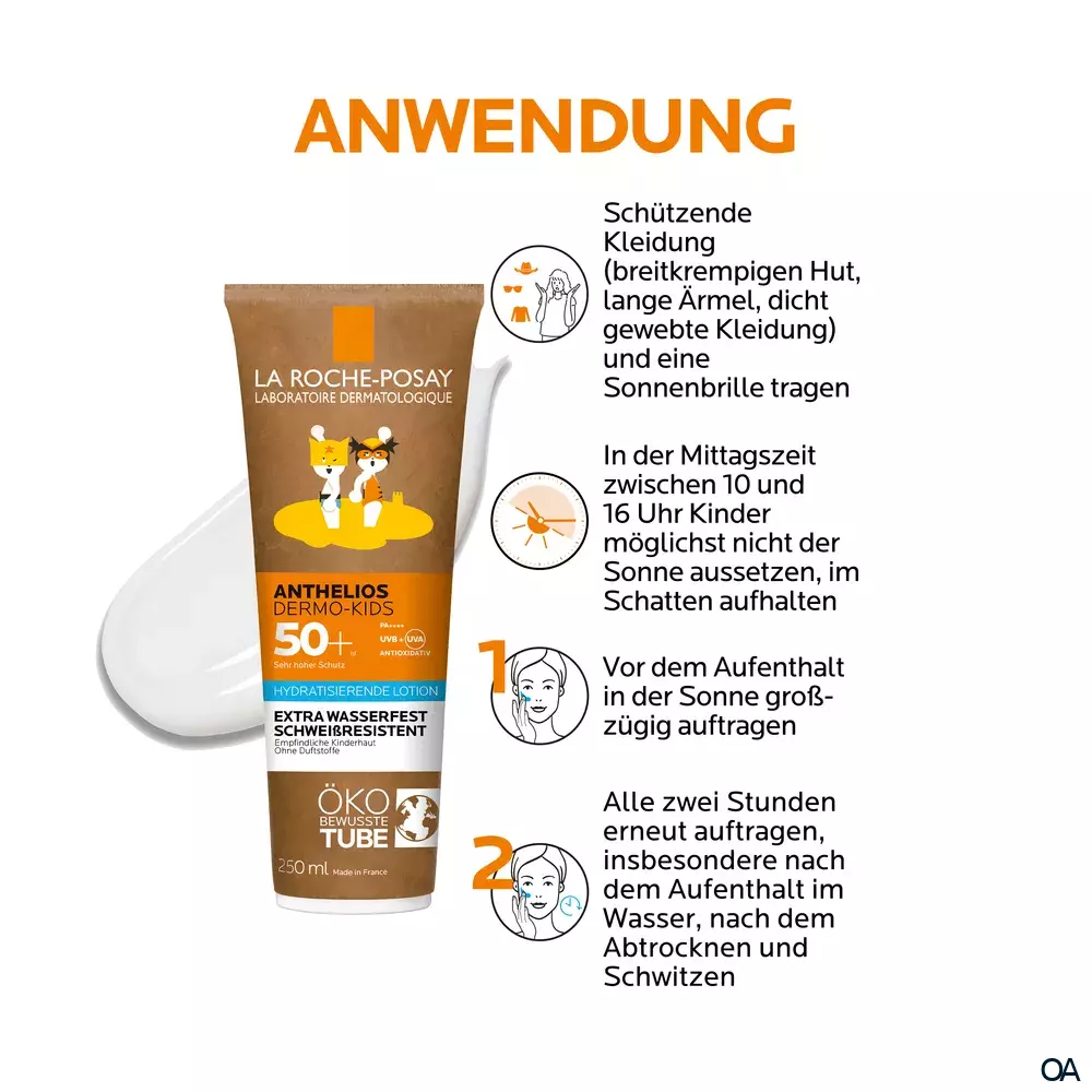 - Die La Roche Posay Anthelios Dermo-Kids Milch LSF 50+ unmittelbar vor dem Sonnenbaden großzügig auf Gesicht und Körper auftragen. Die Allergiker Sonnencreme regelmäßig erneut auftragen - insbesondere nach dem Baden, Schwitzen oder Abtrocknen. Dabei die Augenpartie aussparen. Babys und Kleinkinder sollten nicht der direkten Sonneneinstrahlung ausgesetzt werden. Die Mittagssonne meiden. Zusätzlich sollten Babys und Kleinkinder mit weiteren Sonnenschutzmaßnahmen geschützt werden, wie beispielsweise einer Kopfbedeckung, Sonnenbrille und spezieller UV-Kleidung.