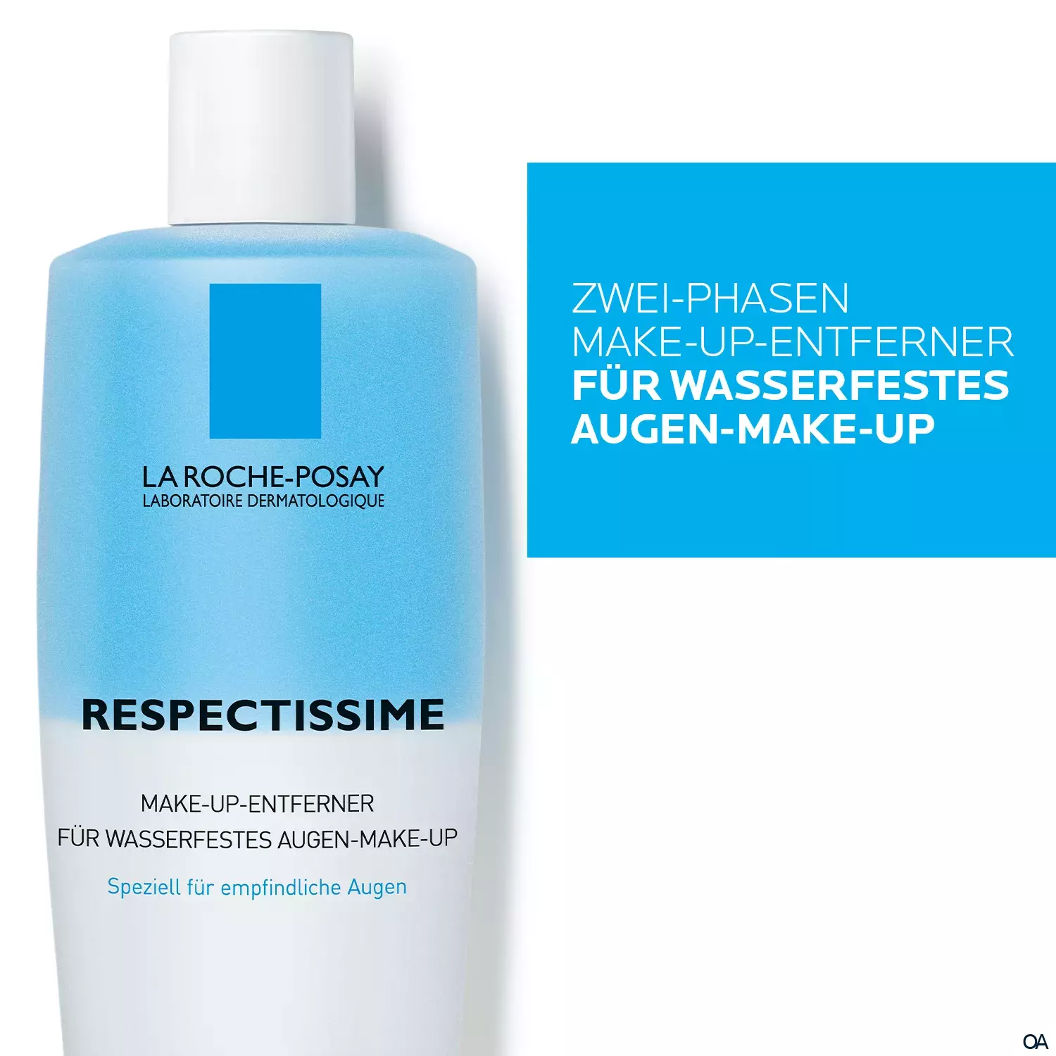 Der RESPECTISSIME AUGEN-MAKE-UP-ENTFERNER überzeugt durch seine duale Wirkung: In der ersten Phase der Anwendung wird wasserfester Mascara durch Fett gelöst. In der zweiten Phase entfernt der Wasseranteil des Produktes den restlichen Fettanteil und letzte Make-up-Partikel. Das Make-up lässt sich sanft und ohne Reiben entfernen, sensible Augen werden geschont. Durch seine wenigen, essentiellen und auf Allergien getesteten Inhaltsstoffe ist RESPECTISSIME von La Roche-Posay auch bei empfindlicher Haut und für jeden Hauttyp geeignet.