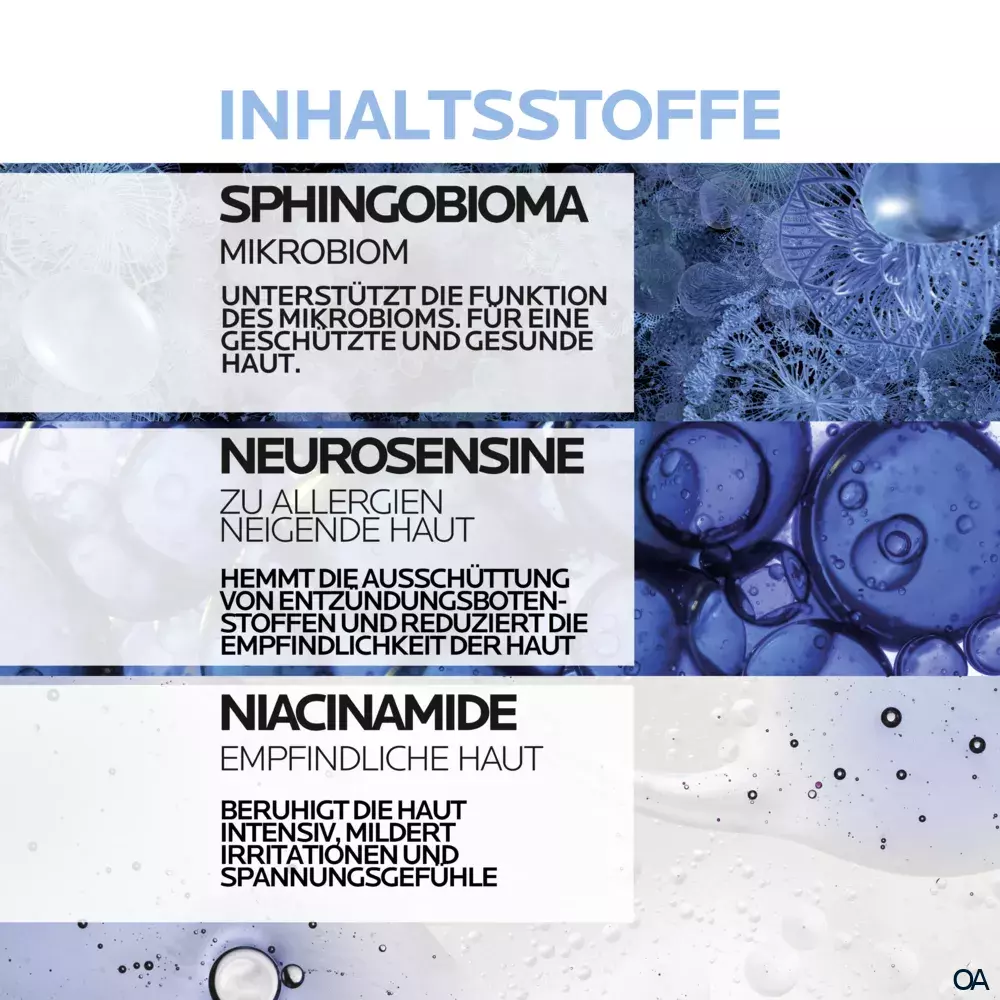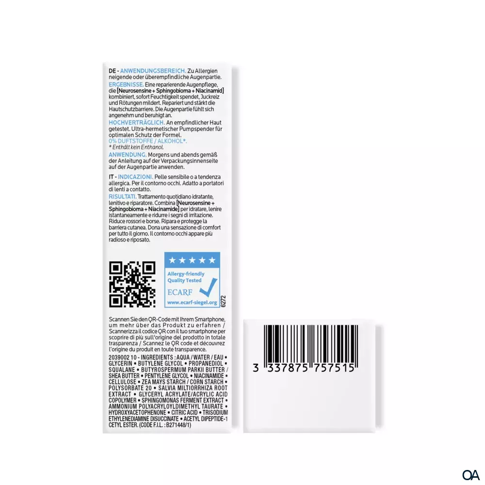 - In unserer regenerierenden und feuchtigkeitsspendenden Augencreme für empfindliche oder gereizte Augenkonturen kombinieren wir verschiedene Wirkstoffe miteinander. Die reparierende Augenpflege enthält zum einen Sphingobioma, unsere aktuellste Innovation zur Stärkung der Funktionen des Mikrobioms der Haut. Die Formel mit Niacinamid und Neurosensine beruhigt intensiv und reduziert Anzeichen von Hautirritationen und Sensibilität. Wir setzen bei der Feuchtigkeitscreme für die zu Allergien neigende oder überempfindliche Augenpartie zudem auf den Einsatz des natürlich beruhigenden und reizmildernden La Roche-Posay Thermalwassers.