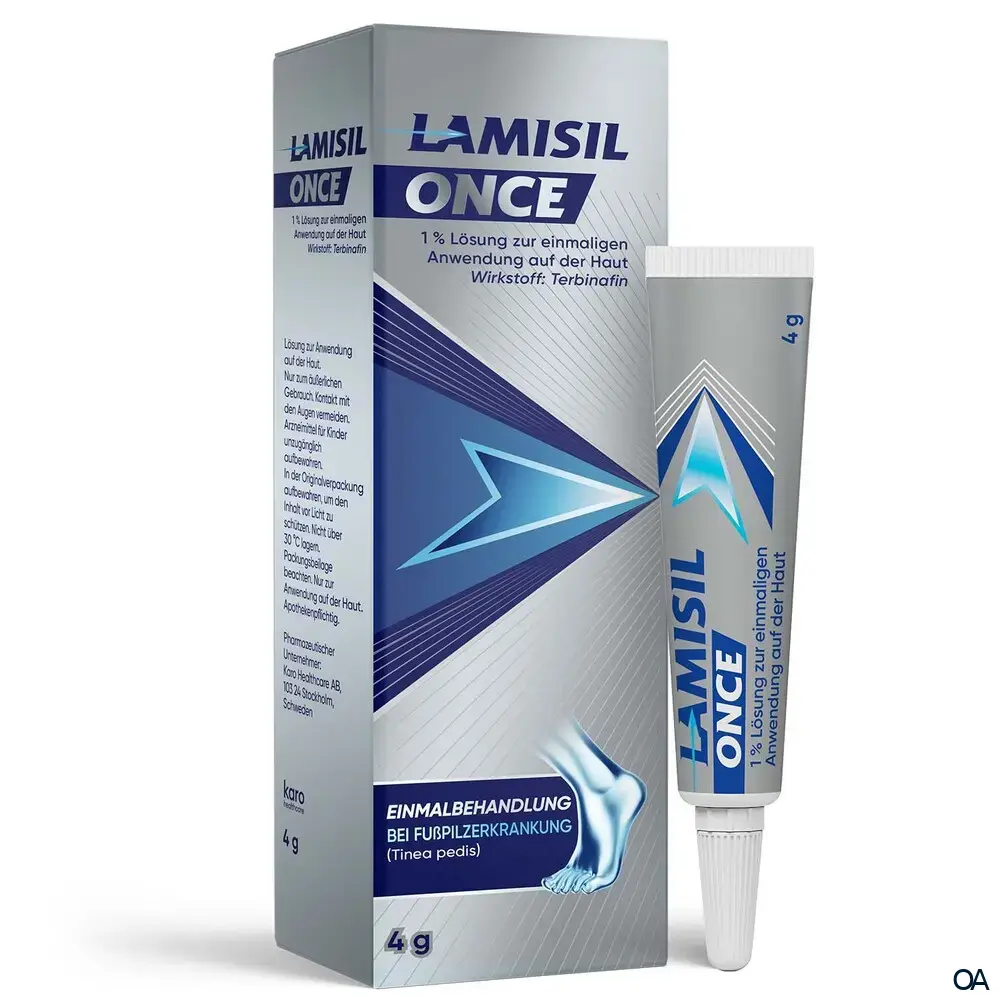 Die LamisilOnce 1 % Lösung zur einmaligen Anwendung auf der Haut ist ein rezeptfreies Arzneimittel mit dem Wirkstoff: Terbinafin und behandelt Tinea pedis (Fußpilzerkrankung) mit einer einzigen Anwendung.