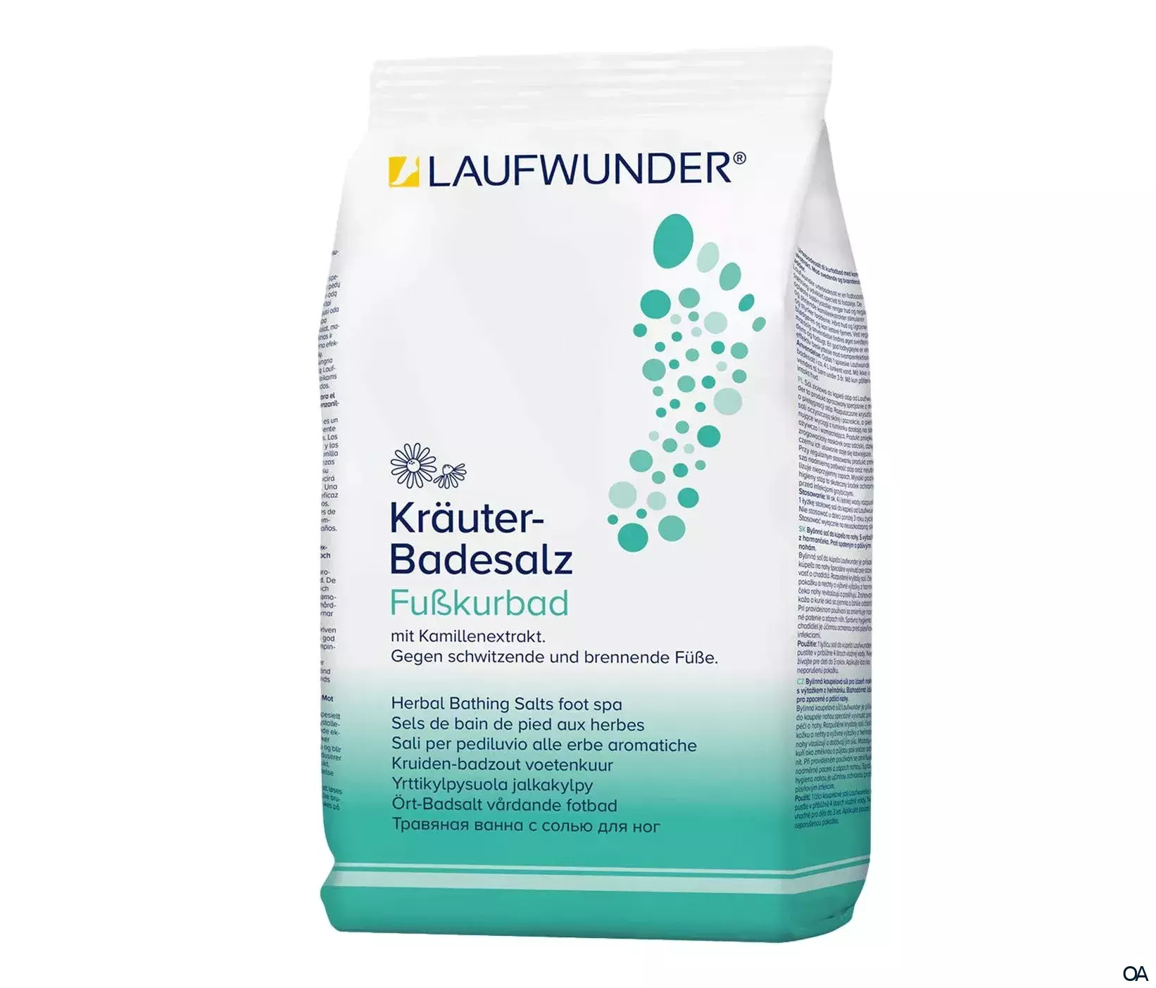 Die gelösten Salzkristalle reinigen Haut und Nägel und pflegende Kamillenextrakt belebt und kräftigt Ihre Füße. Bei überanstrengten, müden und brennenden Füßen wirkt ein Fußbad mit Laufwunder Kräuter-Badesalz erfrischend und belebend, das Wohlbefinden kehrt sofort zurück. Hornhaut und Hühneraugen werden erweicht und lassen sich besser entfernen. Bei regelmäßiger Anwendung werden übermäßige Transpiration und Fußgeruch gelindert. Gute Fußhygiene ist ein wirkungsvoller Schutz vor Pilzinfektionen.
