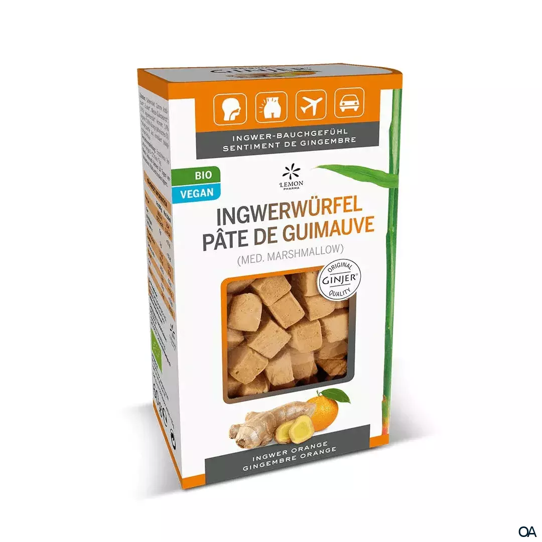 Lemon Pharma Ginjer® Bio Ingwerwürfel sind ein Nahrungsergänzungsmittel mit Ingwer-Orange Geschmack.