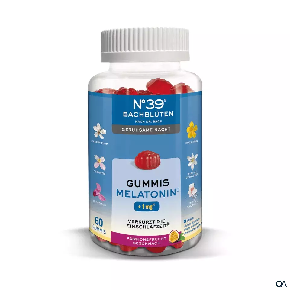 Die Original N°39 Bachblüten Geruhsame Nacht Gummis sind innovative pflanzliche Weichgummis, die helfen abends Ruhe zu finden, um schneller und angenehmer einzuschlafen. Für ein erholtes Aufwachen am Morgen. Ein Original N°39 Bachblüten Gummi Geruhsame Nacht enthält die 6 Bachblütenessenzen, 1 mg Melatonin sowie das Stoffwechselvitamin B6 und Passionsblumenkrautextrakt.