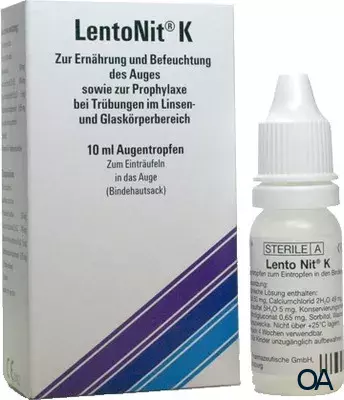 Zur Ernährung und Befeuchtung des Auges sowie zur Prophylaxe bei Trübungen im Linsen- und Glaskörperbereich.LentoNit® K – einzigartige Zusammensetzung:Kaliumiodid 50 mg, Calciumchlorid 2H2O 49 mg, Natriumthiosulfat 5H2O 5 mg, Chlorhexidindigluconat 0,5 mg, SorbitolWer ist betroffen?Mehr als die Hälfte aller Männer und Frauen über 50 Jahren haben Linsenveränderungen:Was sind die Symptome?Die Beschwerden werden meist als “Nebelsehen” beschrieben, d. h. der Betroffene sieht ständig „wie durch Nebel“. Ferner werden oft ein vermehrtes Blendungsempfinden (gelegentlich auch Doppelt- oder Mehrfachsehen), Sehverschlechterung, insbesondere bei hellem Licht, und eine Beeinträchtigung des Farbempfindens angegeben. Bleibt der Altersstar unbehandelt, wird das Sehvermögen des Betroffenen durch die Linsentrübung derart verschlechtert, dass schließlich nur noch Lichtschein wahrgenommen werden kann.Die Zuhause-Kur für Ihre AugenIn vielen Kuranstalten und Heilbädern werden seit langem Jod-Augenbäder zur Behandlung von Augenerkrankungen, wie dem beginnenden Grauen Star oder dem Trockenen Auge, angeboten. Nutzen Sie mit LentoNit® K die „Zuhause-Kur“ mit jodidhaltigen Augentropfen für Ihre Augen, und beugen Sie so aktiv dem “Nebelsehen” im Alter vor!Was können Sie tun?Durch die regelmäßige Ernährung und Befeuchtung des Auges mit LentoNit® K können Sie einigen für den Altersstar mitverantwortlichen Faktoren entgegenwirken: Freie Radikale werden allgemein als Schlüsselfaktor des Alterungsprozesses gesehen, sie greifen die Körperzellen an und schädigen diese (sog. oxidativer Stress).Im Auge ist dieser oxidative Stress durch den starken Lichteinfall noch zusätzlich erhöht, da v.a. das UV-Licht zur erhöhten Belastung mit freien Radikalen führt. Zum Schutz vor oxidativen Stress dienen sog. Antioxidantien, die mit den freien Radikalen reagieren und diese unschädlich machen; sie werden daher auch als „Radikalfänger“ bezeichnet. Antioxidantien kann der Körper nicht selbst herstellen, sie müssen stetig zugeführt werden.Neben der Staroperation bei der weit fortgeschrittene Linsentrübung, besteht ein Behandlungsansatz in der Prophylaxe des Altersstars mit „Radikalfängern“, wie z.B. dem Jodid: Aktuelle wissenschaftliche Studien belegen, dass die Verwendung von jodidhaltigen Augentropfen einen positiven Effekt bei chronischen Augenerkrankungen wie dem Katarakt2 oder auch dem Trockenen Auge3 hat. Im Rahmen einer Studie wurden 255 Patienten mit jodidhaltigen Augentropfen* behandelt. Die gewonnenen Daten des Krankheitsverlaufs dieser Patienten wurde mit den Werten von 491 Patienten verglichen, die bei gleichlautender Diagnose über einen identischen Zeitraum ohne Behandlung belassen wurden. Die Ergebnisse zeigen, dass die Verwendung der jodidhaltigen Augentropfen bei den behandelten Patienten mit Altersstar das Fortschreiten der Linsentrübung im Vergleich zu der unbehandelten Patientengruppe bis zu einem 2,5fachen- Zeitfaktor verzögern, bzw. die Verschlechterung des Sehvermögens aufhalten konnte4.* Zusammensetzung wie LentoNit® K Augentropfen.2 Muranov K, Poliansky N, Winkler R, Rieger G, Schmut O, Horwath-Winter J. Protection by iodide of lens from selenite-induced cataract. Graefes Arch Clin Exp Ophthalmol. 2004; 242: 146-1513 Rieger G. Anto-oxidative capacity of various artifical tear preparations. Graefes Arch Clin Exp Ophthalmol. 2001; 239 (): 222-2264 Roth HW, Radler M. Zur Frage einer konservativen Therapie der Katarakt. Der Augenspiegel 1999; 45: 38-44