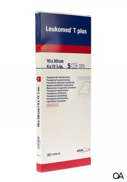 Der postoperative Folienverband Leukomed T plus mit stark saugfähiger Wundauflage ermöglicht dem Patienten seine gewohnte Alltagsaktivitäten frühzeitig wieder aufzunehmen. Der Klebeauftrag erhält die Atmungsaktivität der Folie und reduziert das Risiko von Mazerationen. Durch die hohe Wasserdampfdurchlässigkeit werden Feuchtigkeitsansammlungen verhindert und eine sichere Anwendung gewährleistet. Die hochflexible, wasserdichte Folie hat einen sehr hohen Tragekomfort und sitzt auch an Gelenken und Extremitäten wie eine zweite Haut. Leukomed T plus ist steril und bietet einen zuverlässigen Schutz gegen Bakterien und Keime. Die abgerundeten Ecken gewährleisten eine sichere Fixierung und verhindern ungewolltes Aufrollen. Das Applikationssystem mit dem roten Streifen gewährleistet eine unkomplizierte, schnelle Anwendung, auch wenn Handschuhe getragen werden. Leukomed T plus besteht aus einer extradünnen Polyurethanfolie, beschichtet mit Polyacrylatkleber. Die Wundauflage besteht aus einem Viskosevlies, beschichtet mit Polypropylen.