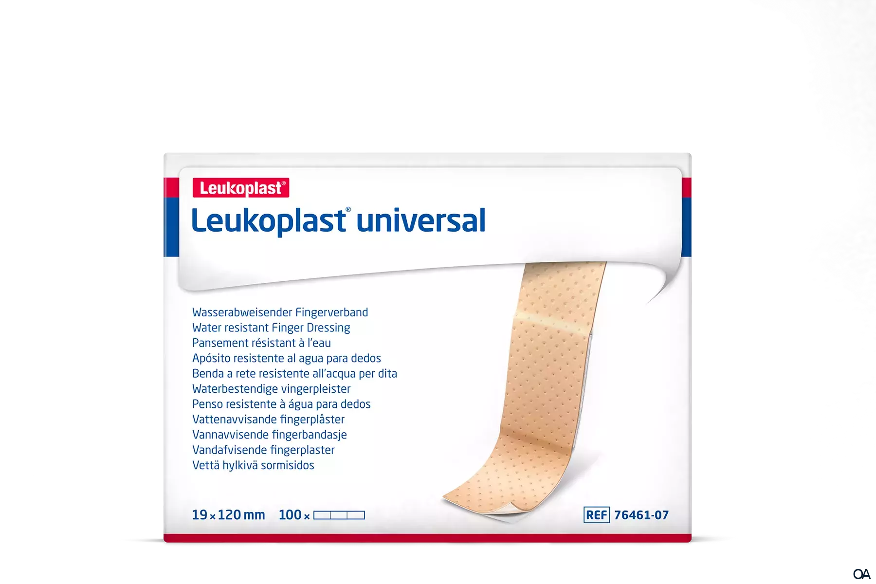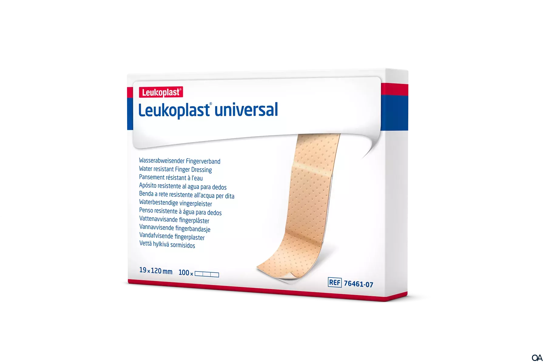 Leukoplast ist auch bei Wundschnellverbänden die erste Wahl. Leukoplast universal ist hautfreundlich, atmungsaktiv sowie wasser- und schmutzabweisend. Leukoplast universal ist ideal für feuchte und schmutzige Umgebungen. Leukoplast universal besteht aus einem Vlies-Folien-Laminat mit Vlieswundauflage, die nicht mit der Wunde verklebt. Die Leukoplast universal Fingerstrips sind vollständig latexfrei. Leukoplast universal ist mit einem Acrylatkleber beschichtet.