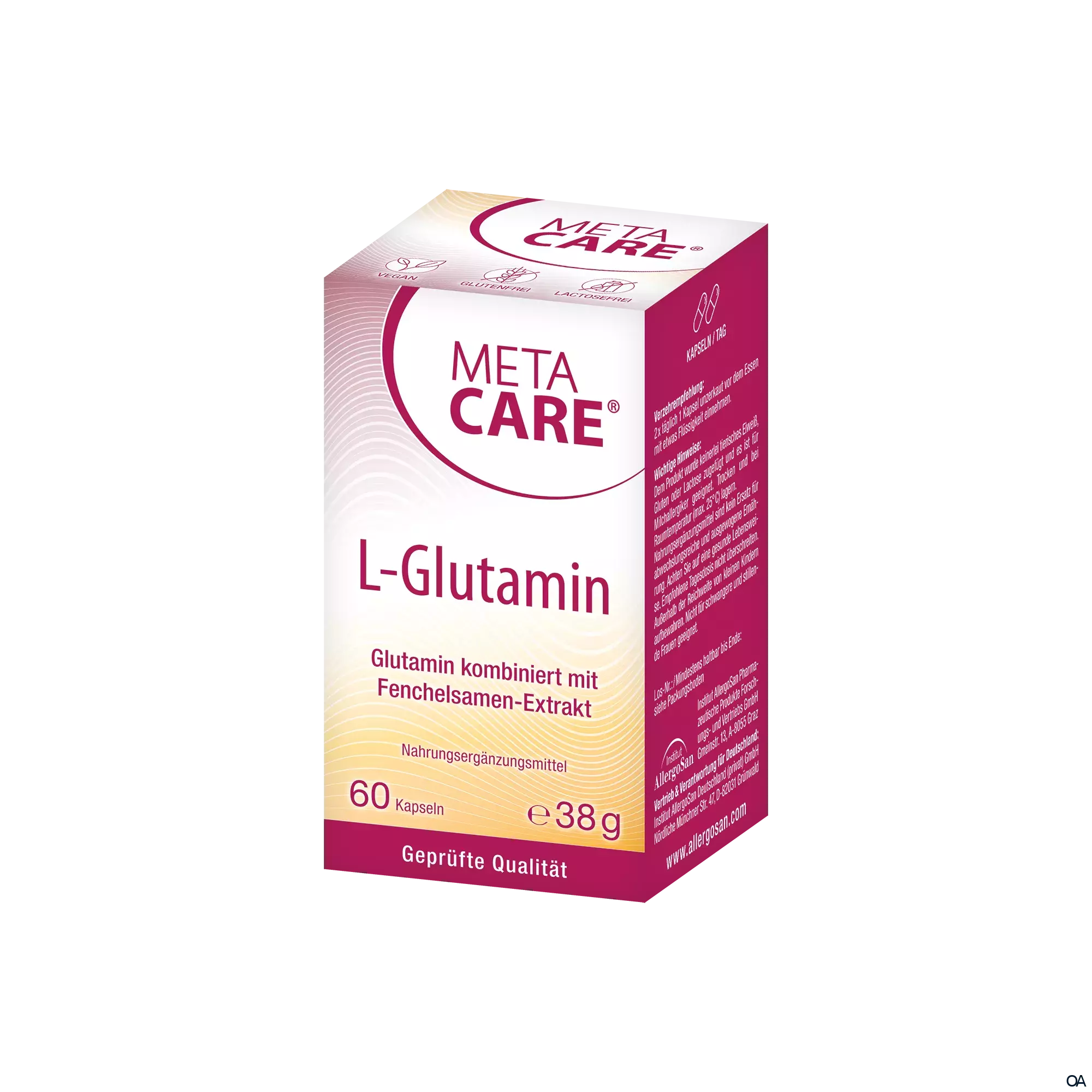 - META-CARE® L-Glutamin kombiniert wertvolles Glutamin mit Biotin und dem bei Blähungen speziell wohltuenden Extrakt aus Fenchelsamen. So kann META-CARE® L-Glutamin die Bedürfnisse der Darmschleimhaut neben der täglichen Ernährung und der körpereigenen Synthese sinnvoll unterstützen.