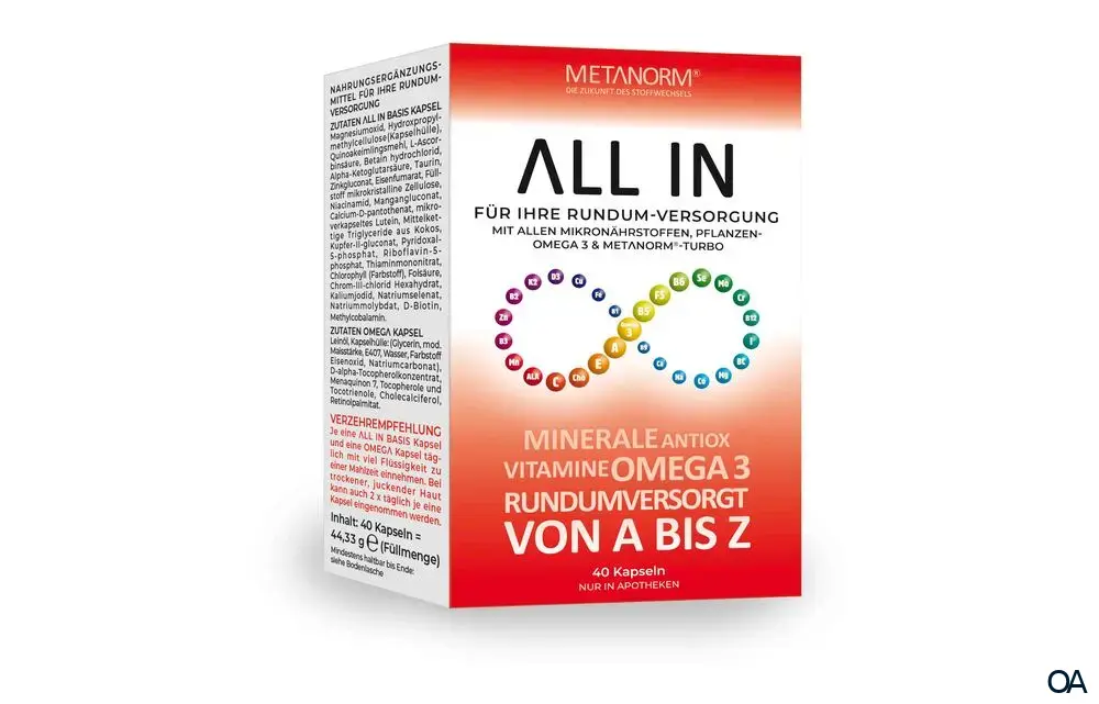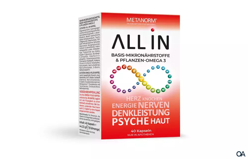 METANORM® ALL IN Kapseln sind ein Nahrungsergänzungsmittel, das die gesamte Familie mit allen wichtigen Mikronährstoffen versorgt. Die Kapseln enthalten unter anderem Vitamine, Mineralstoffe, Spurenelemente und Omega-3-Fettsäuren.