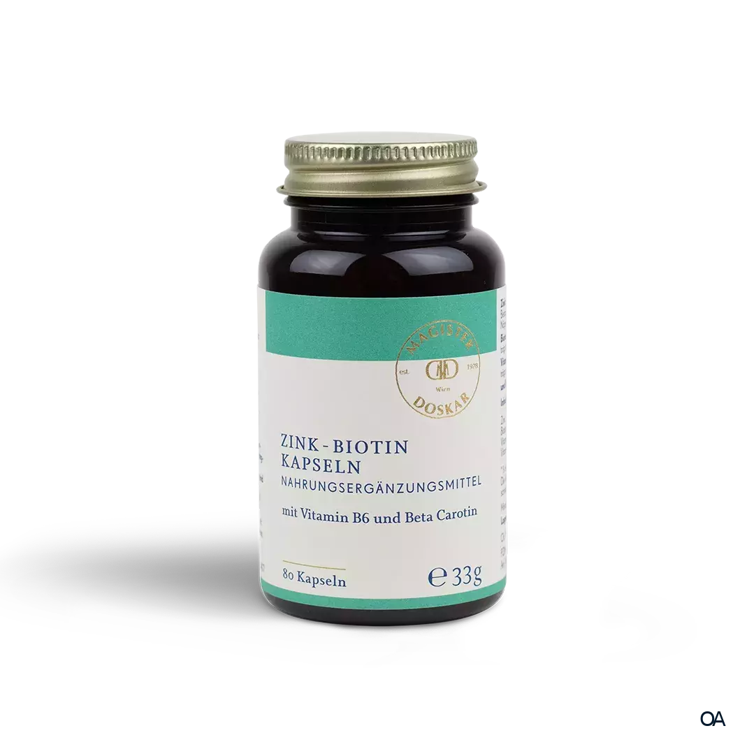 Magister Doskar Zink-Biotin Kapseln ist ein Nahrungsergänzungsmittel mit Zink-Biotin mit Vitamin B6 und Beta Carotin für Haut, Haare und Nägel. Die Einnahme von Zink empfiehlt sich auch bei einer erhöhten Infektanfälligkeit.