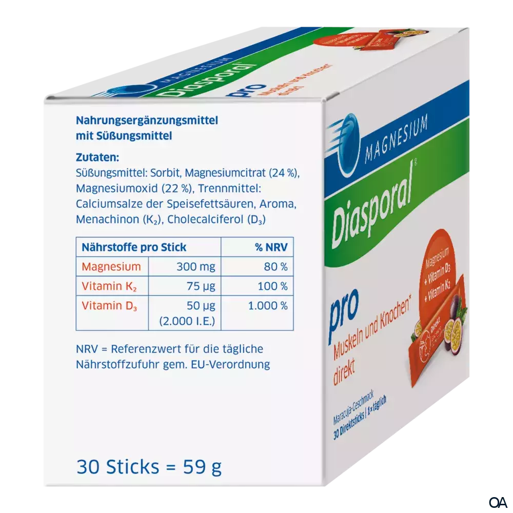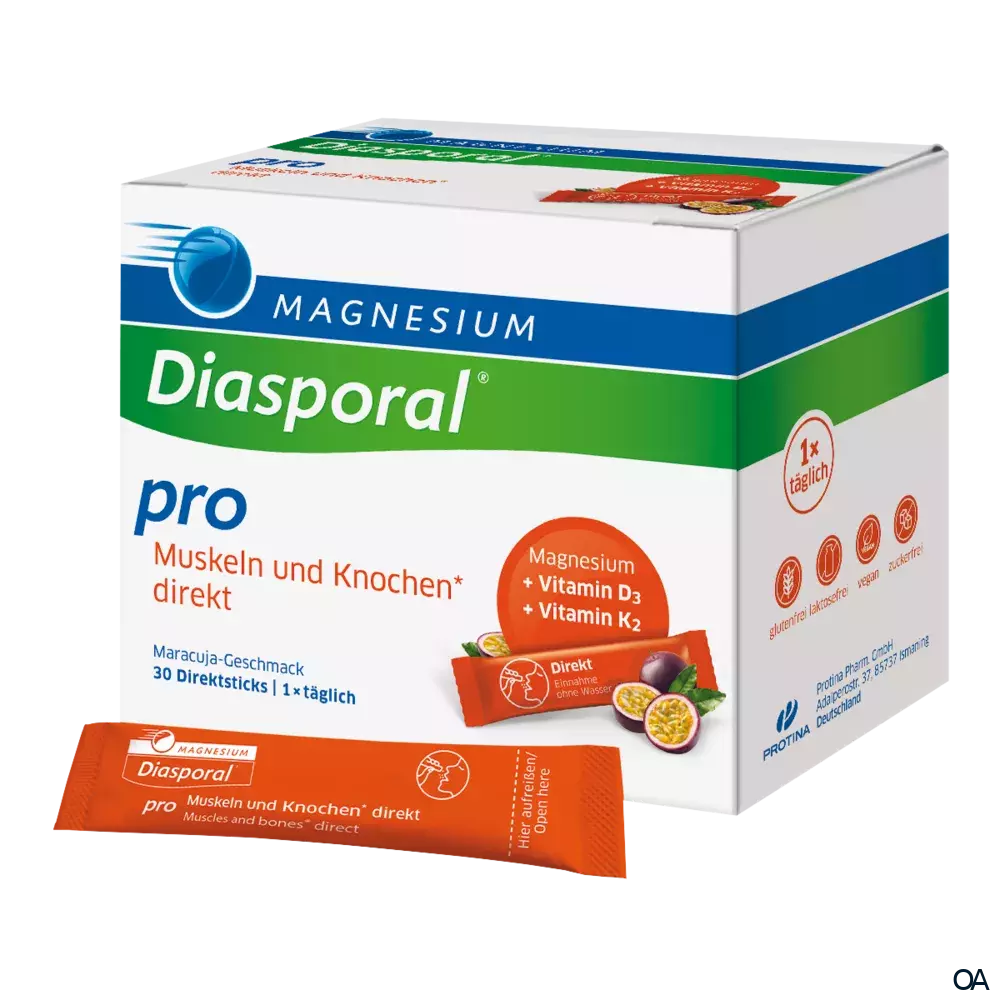 Magnesium-Diasporal® Pro Muskeln und Knochen direkt ist ein Kombinationspräparat mit hochdosiertem Magnesium plus den Vitaminen D3 und K2. Das Direktgranulat ist ideal für unterwegs, da es sich schnell und ohne Flüssigkeit einnehmen lässt. Es hat einen fruchtigen Maracuja-Geschmack und enthält neben körperfreundlichem Magnesiumcitrat auch Magnesiumoxid sowie die Vitamine D3 und K2.