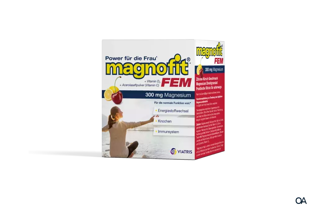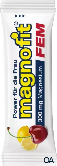 Magnofit® FEM Direktgranulat Sticks sind ein Nahrungsergänzungsmittel mit fruchtigem Zitrone - Kirsch Geschmack, 300 mg Magnesium, Vitamin D3 + Acerolasaftpulver (Vitamin C). Praktisch für unterwegs und zur Unterstützung für die aktive Frau.