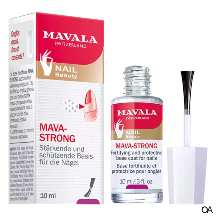 MAVA-STRONG, eine stärkende Basis, erlaubt gespaltene, weiche und somit brüchigen Fingernägel, ihr normales und kräftiges Aussehen wiederzugewinnen. Er kombiniert zwei Wirkungen die synchronisch zusammenarbeiten: Stärkung und Schutz. Es handelt sich um einen farblosen, glänzenden Nagellack, dessen aktive Inhaltsstoffe Technik und Effizienz kombinieren, um die Qualität der Nägel zu verbessern und um ihre Struktur zu stärken. Sein Komplex von mikroverkapselten Wirkstoffen (ätherische Öle vom Teebaum, Vitamin E, hydrolysierte pflanzliche Proteine und Arginin) stärken die Nägel, und sein kristallines Harz machen die Nagelplatte widerstandsfähiger und dicker.