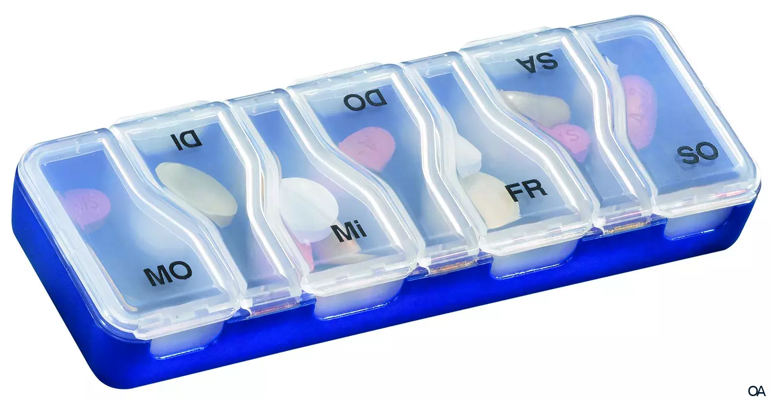 Die zuverlässige Hilfe für alle Menschen, die regelmäßig einmal täglich Arzneimittel einnehmen müssen. Dient der Arzneimittelsicherheit und kontrolliert die richtige Einnahme der vom Arzt verordneten Medikamente. Übersichtlich und einfach in der Handhabung. Die großen Einzelfächer bieten genügend Platz zur Aufnahme von mehreren Medikamenten. Aus hochwertigem und langlebigem ABS-Kunststoff hergestellt. Jahrelang bewährt im ambulanten und stationären Einsatz. Keine scharfen Kanten oder Ecken.